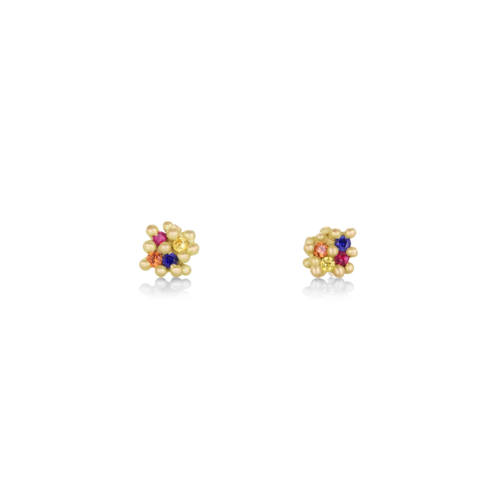 Follow the magic in this pair of 18k yellow gold studs from Marian Maurer. Simple prong settings hold clusters of twinkling multicolored sapphires. Studs measure just under 1/4". Handcrafted in Brooklyn, NY, U.S.