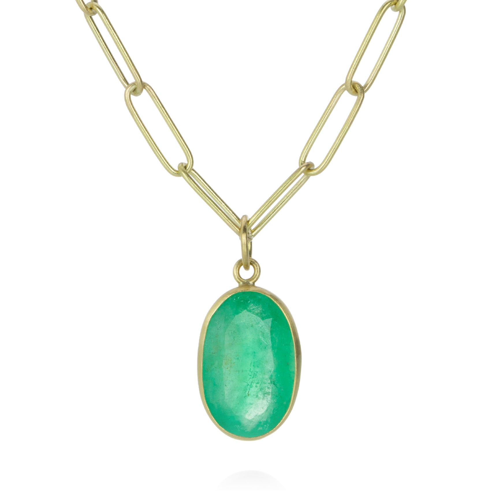 May babies, take notice! This 18k yellow gold pendant from Maria Beaulieu features a faceted oval, 9ct emerald set in a bezel. This vibrant, verdant gem shines in its minimalist setting, measuring 7/8” in length with bail. Pair it with one of the artist’s coveted handmade chains to complete the designer look . Chain sold separately. Handcrafted in Brooklyn, NY, U.S.