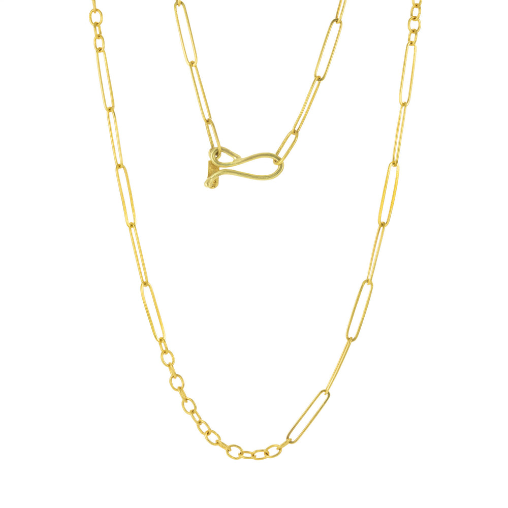 So many possibilities await in this 22k yellow gold handmade chain from Rosanne Pugliese! Handmade paperclip links are stationed with sections of circle link chain and an 18k yellow gold hook clasp. Total length measures 17 1/2“ adjustable. Handcrafted in Brooklyn, NY, U.S.