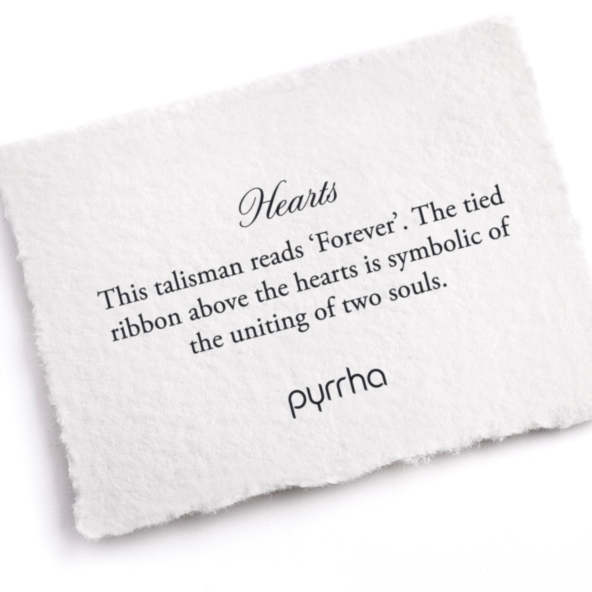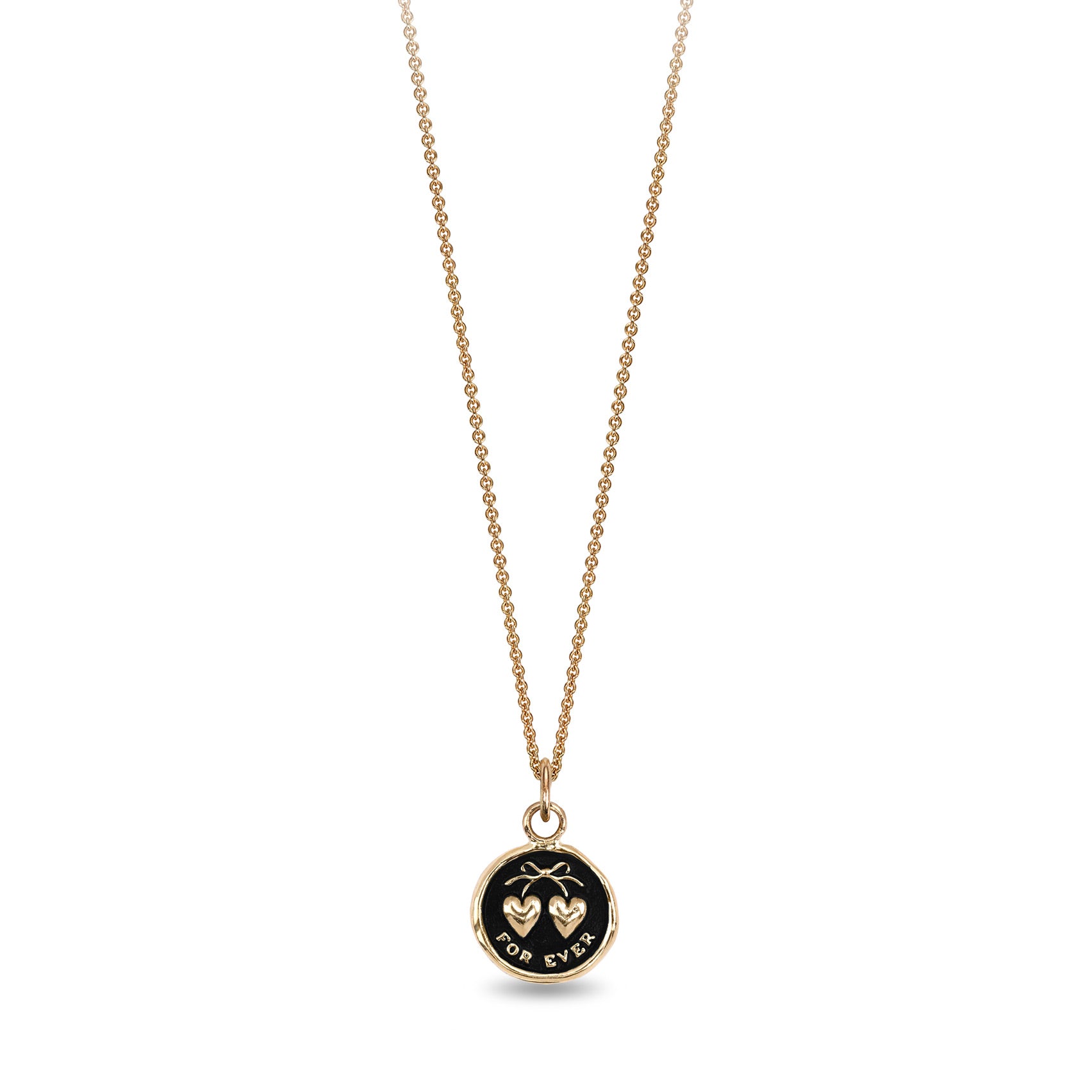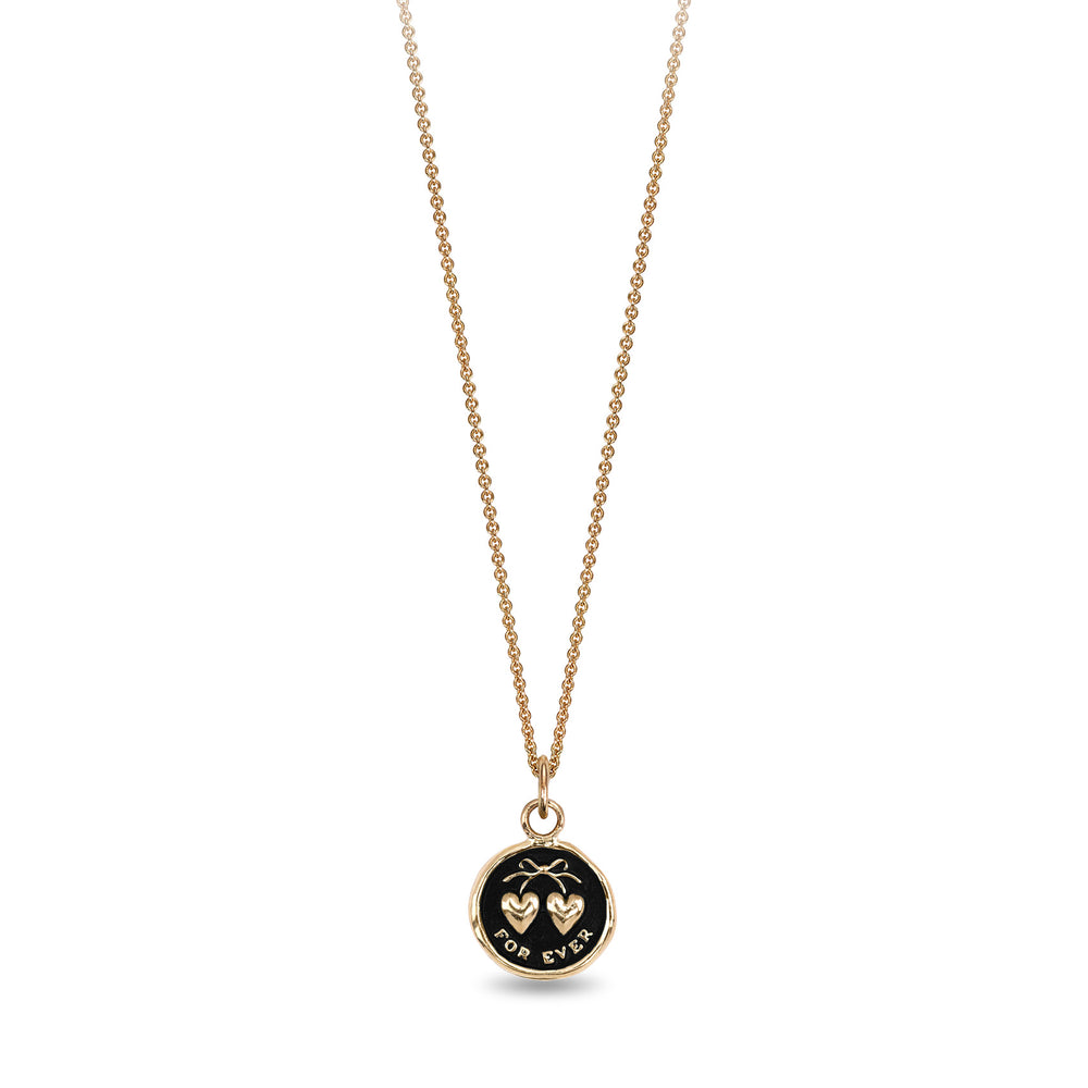 A tied ribbon above the two hearts on this Pyrrha pendant is symbolic of the uniting of two souls. Below the hearts reads 'Forever'. Lovingly and sustainably cast in recycled 14k yellow gold with a layer of black ceramic, this potent talisman hangs on an 18" fine cable chain with lobster clasp. Consider adding a Pyrrha attraction charm to this piece for an extra layer of color and meaning. Pendant measures 5/8" in total length, including bail. Handcrafted in Vancouver, Canada.