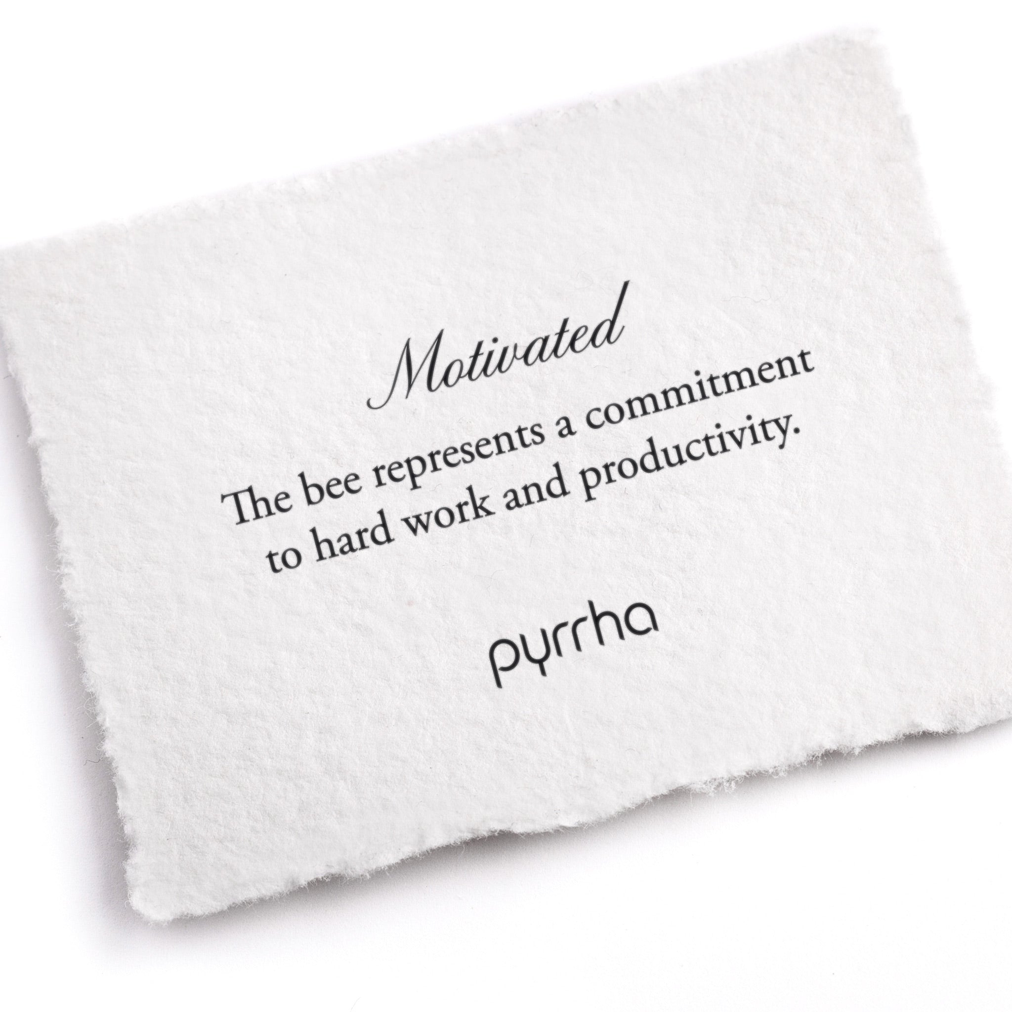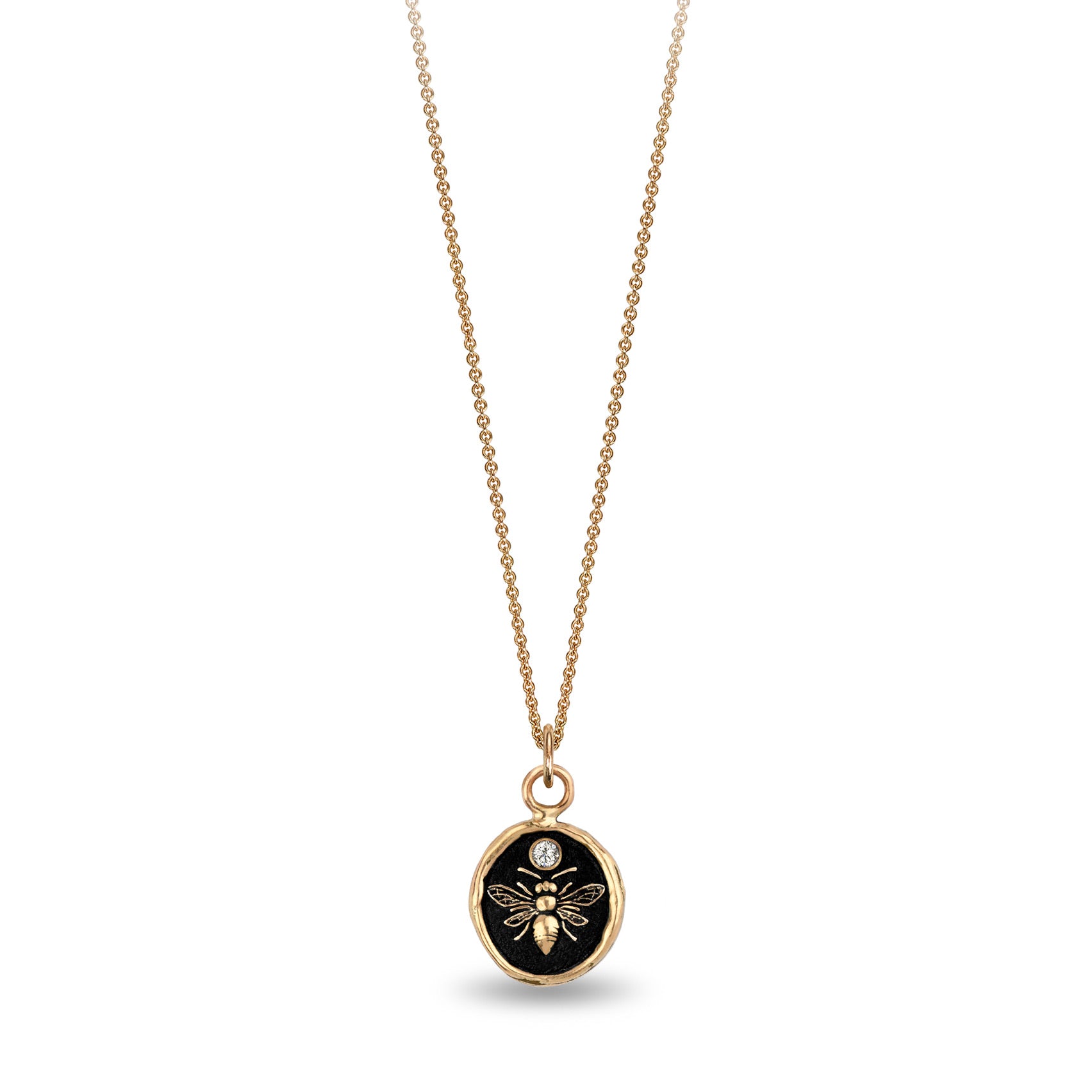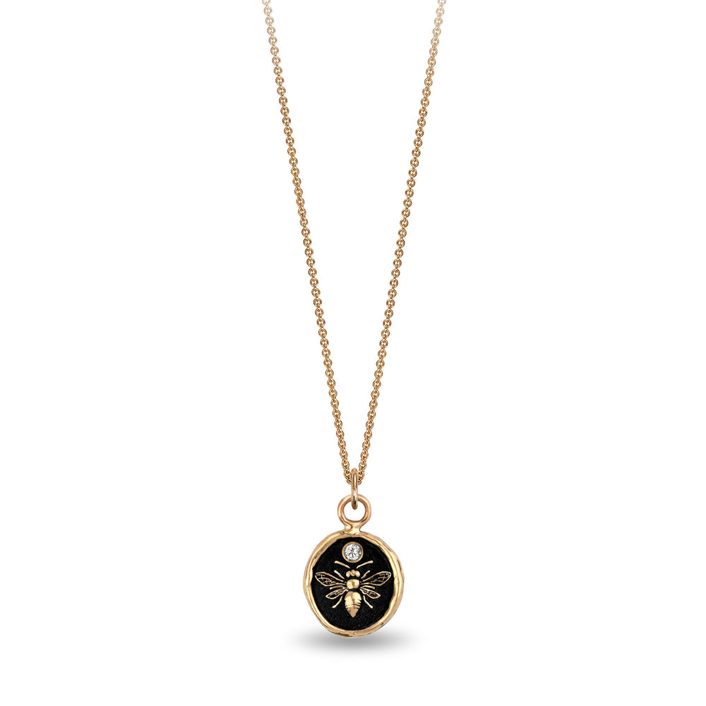 Celebrate what you love about yourself or cherish in others. The bee on this Pyrrha pendant represents a commitment to hard work and productivity. A single conflict-free, brilliant cut diamond shines above. Lovingly and sustainably cast in recycled 14k yellow gold with a layer of black ceramic, this potent talisman hangs on an 18" 14k yellow gold fine cable chain with lobster clasp. Pendant measures 5/8" in length, including bail. Handcrafted in Vancouver, Canada.