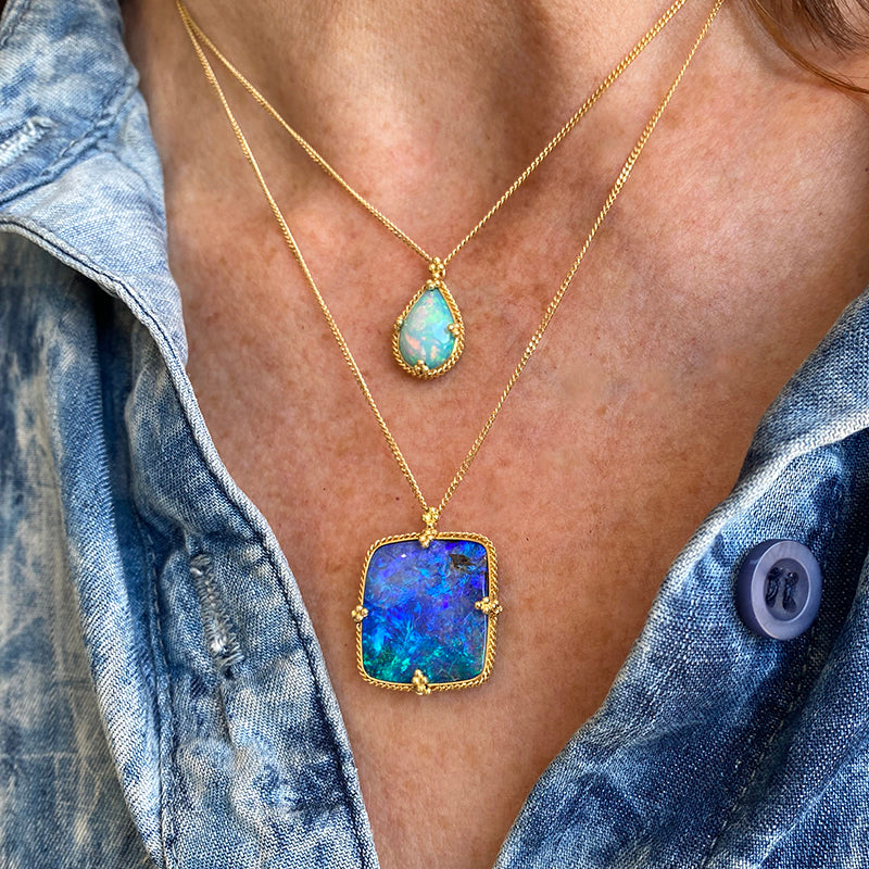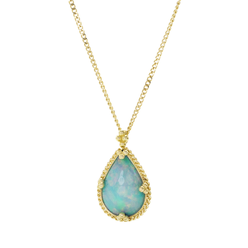 The stone of inner fire and intuition, opal opens up our creative fields and, through its watery makeup, lets a vibrant spectrum of healing energy flow. This 18k yellow gold necklace from Amali features a 2.08ct teardrop shaped Ethiopian opal pendant, dressed in granulation and chain detailing along the bezel. Pendant measures 5/8" including the bail. Total length measures 16”-18” adjustable with lobster clasp. Handcrafted in New York, NY, U.S.