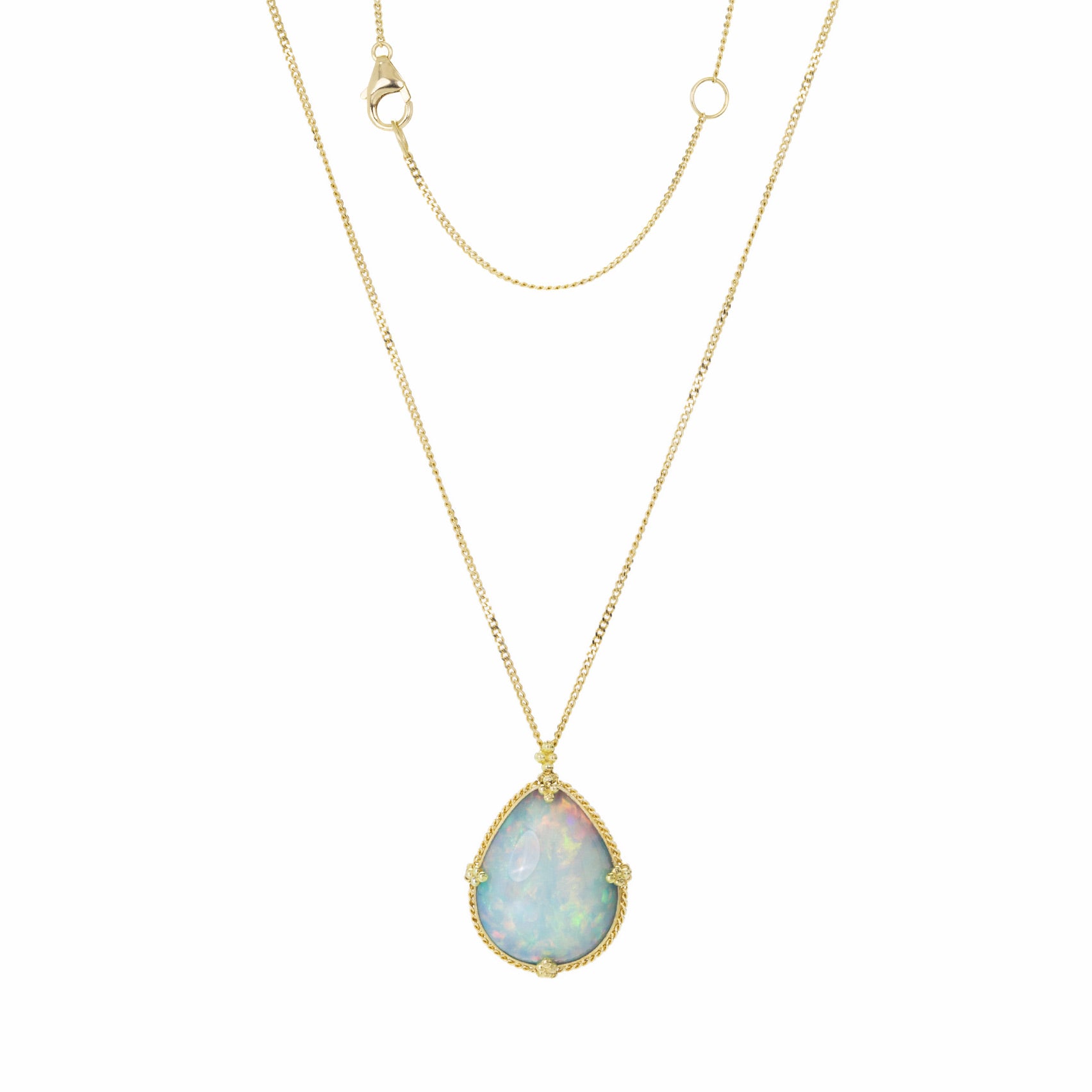 Travel through dimensions of magical color in this 18k yellow gold necklace from Amali, featuring a pear shaped 7.35ct Ethiopian opal pendant. The bezel set stone is adorned with granulation and fine chain detailing. Pendant measures 1” in length, including the bail. Total chain length measures 16”-18” adjustable with lobster clasp. Handcrafted in New York, NY, U.S.