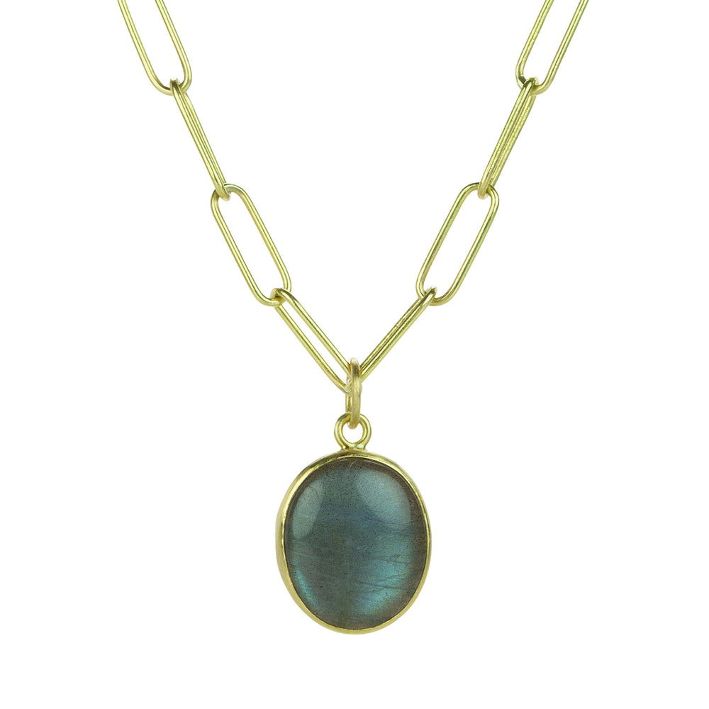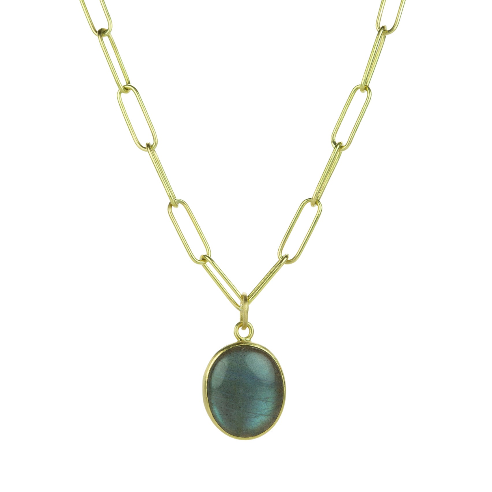 For Maria Beaulieu, it's all about the stones! This pendant features a softly glowing oval labradorite in a minimal 18k gold bezel that highlights the stone's natural beauty. Pair it with one of Maria's handmade chains for a look of subtle sophistication. Labradorite measures 12mm x 15mm. Pendant length measures 7/8”. Chain is sold separately. Handcrafted in Brooklyn, NY, U.S.