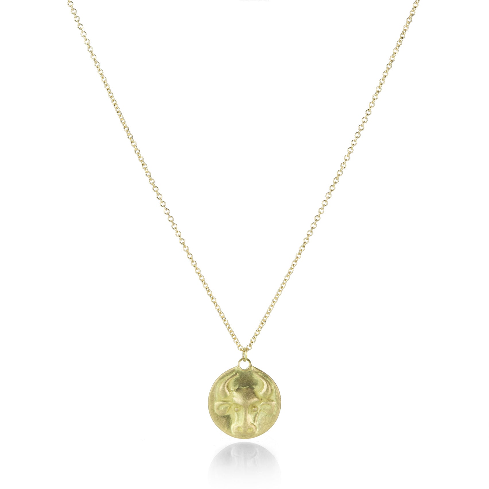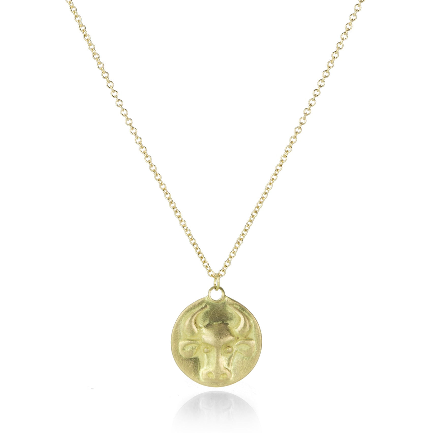 Calling all Taureans! This 18k yellow gold necklace from Marian Maurer celebrates you with a round, brushed, hand carved Taurus pendant. Ruled by Venus and the element of earth, those born under the sign of Taurus are strong, dependable, sensual and creative. Pendant measures approximately 1/2" in diameter on a 16" chain. Handcrafted in Brooklyn, NY, U.S.