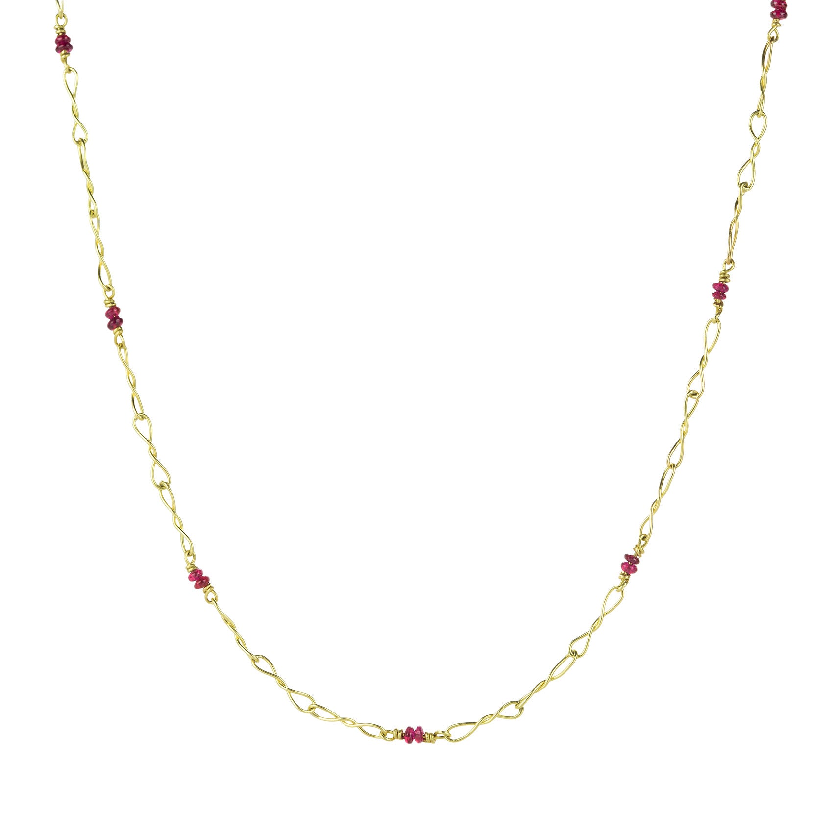 Layer on the links in this 18k yellow gold twisted popsicle chain necklace from Lene Vibe. Smooth ruby beads twinkle and shine along the hand formed links. Total length with lobster clasp measures 18". Handcrafted in Denmark.