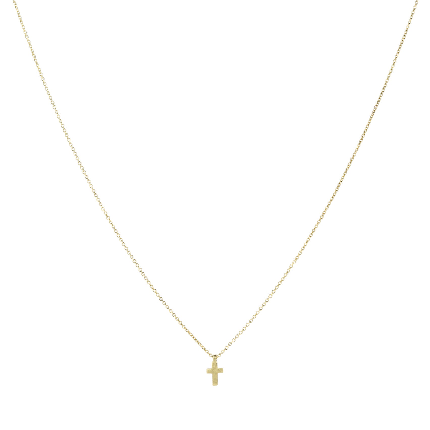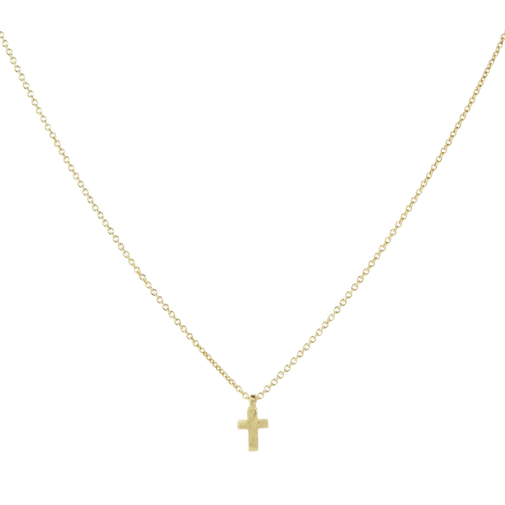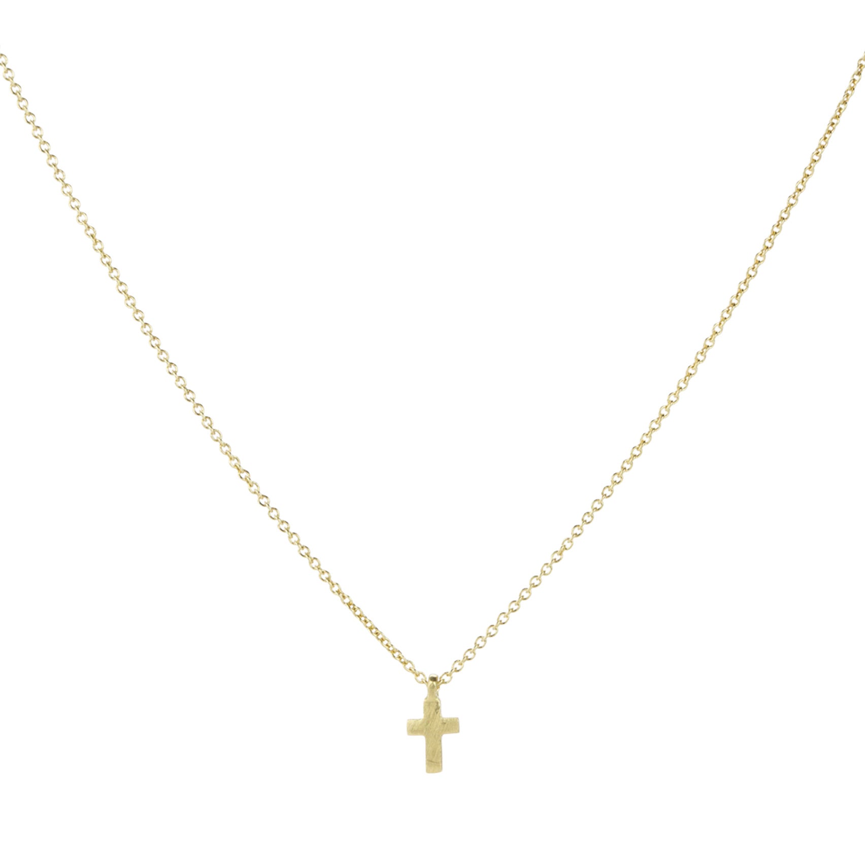 Hold your spirit close to your heart in this 18k yellow gold necklace from Marian Maurer. A sliding micro cross pendant features a silky brushed surface. Pendant measures 1/4” x 1/8”. Chain length measures 16”, finished with a lobster clasp. Handcrafted in Brooklyn, NY, U.S.