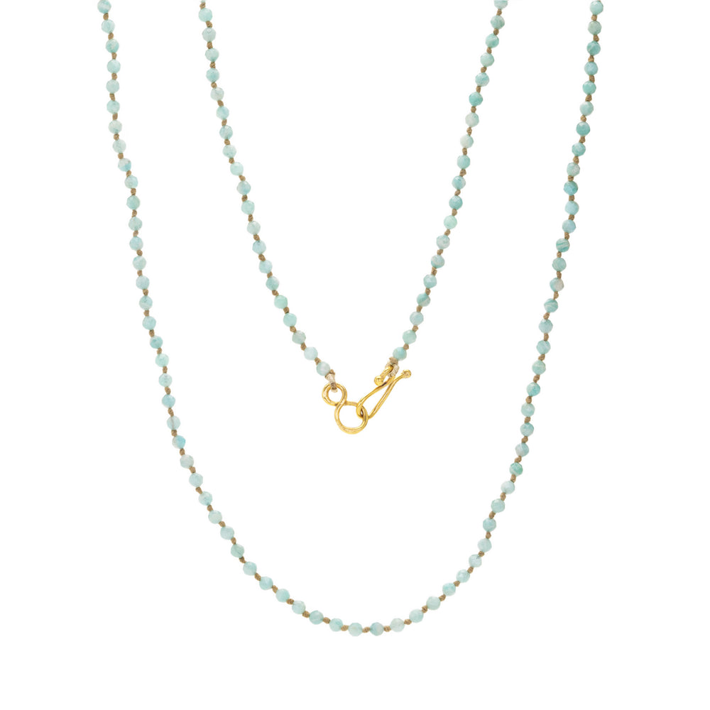 Infuse a long layer of luscious gemstone sparkle to your look in this simply elegant beaded necklace from Lena Skadegard. Faceted amazonite beads find the light in a hand knotted arrangement with lovely drape. Total length with a 9k yellow gold hook clasp measures 30". Handcrafted in India.