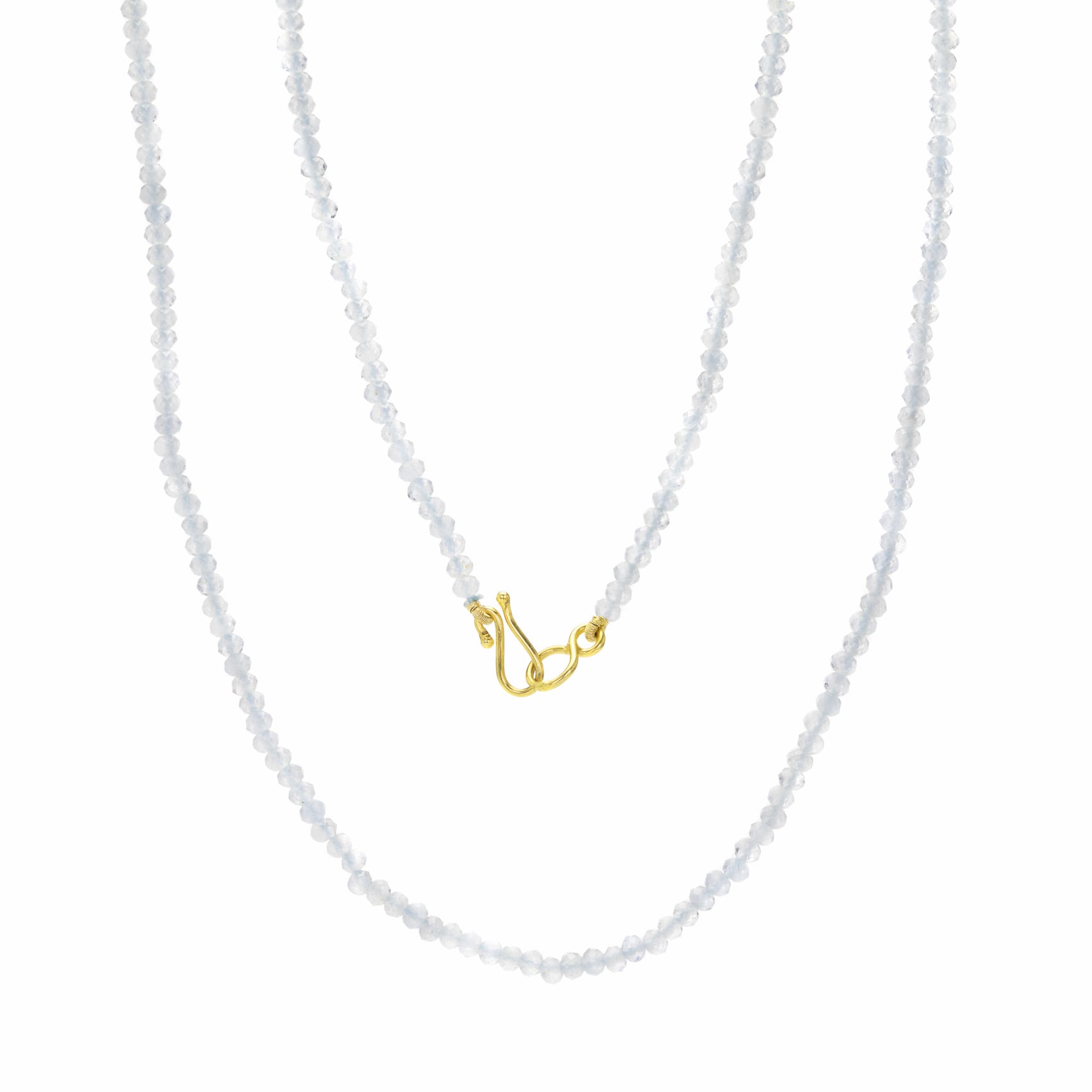 This sparkly beaded necklace from Lena Skadegard adds a splash of color to your layered look, or stands alone as a soft, simple statement. Faceted aquamarine beads are set off by a gleaming 9k yellow gold hook and eye clasp. Total length measures 32". Handcrafted in India.