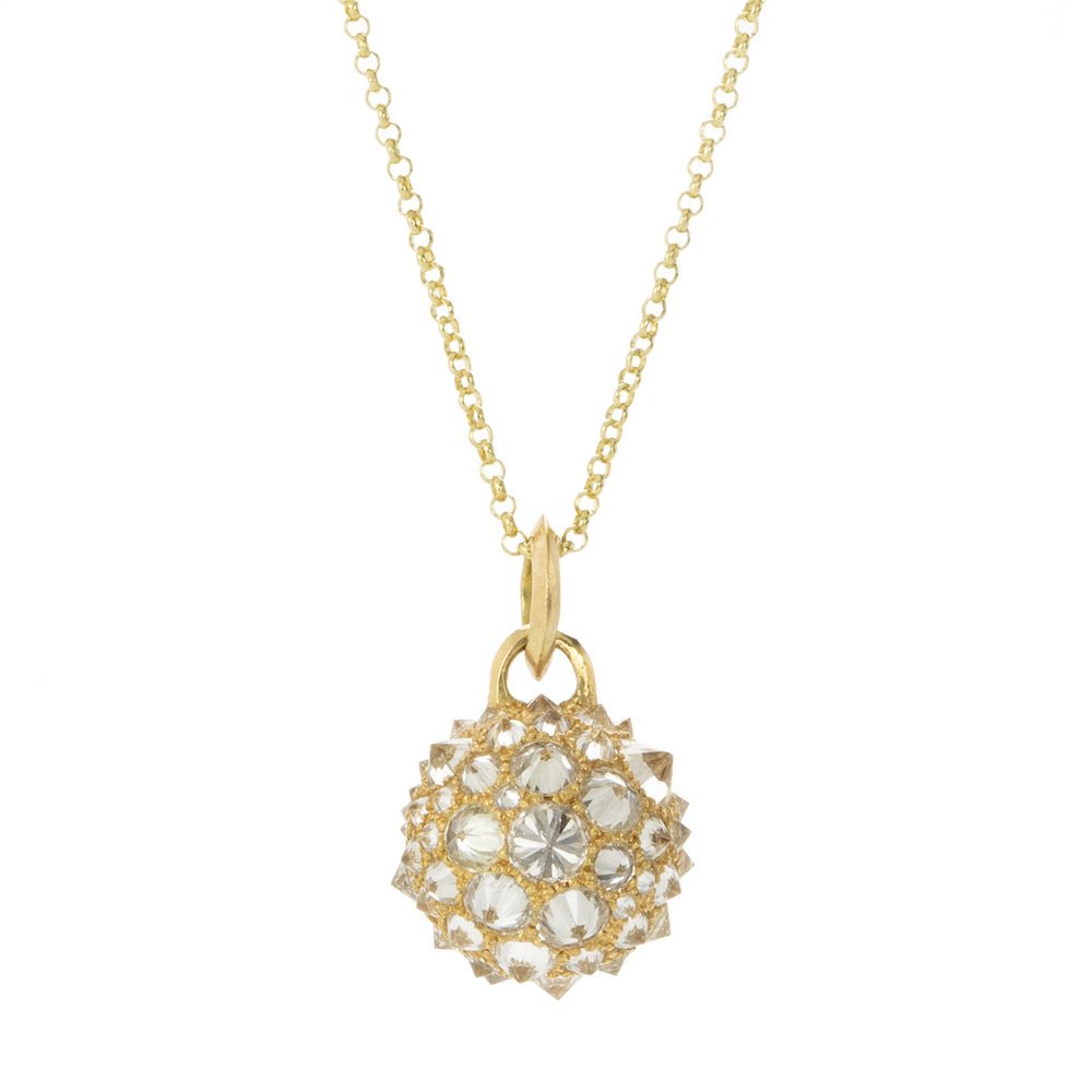 Sparkle with the light of a million suns in this breathtaking pendant from Tamsin Rasor. An 18k yellow gold orb charm is covered with inverted white diamonds totaling 3.60cttw. This luxurious show piece beams with fiery magic and hangs from an elegant knife edge bail. Charm length measures 5/8" including bail. Pendant only, chain is sold separately. Handcrafted in New York, NY, U.S.