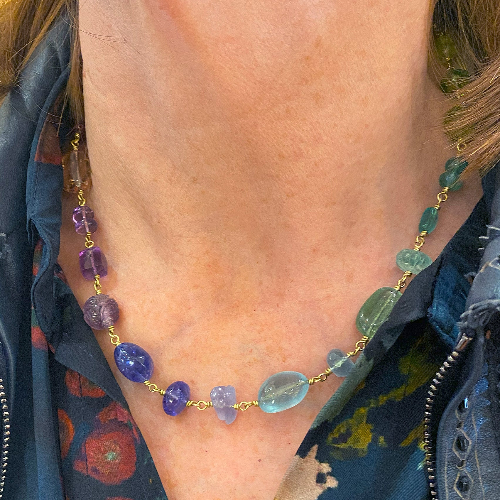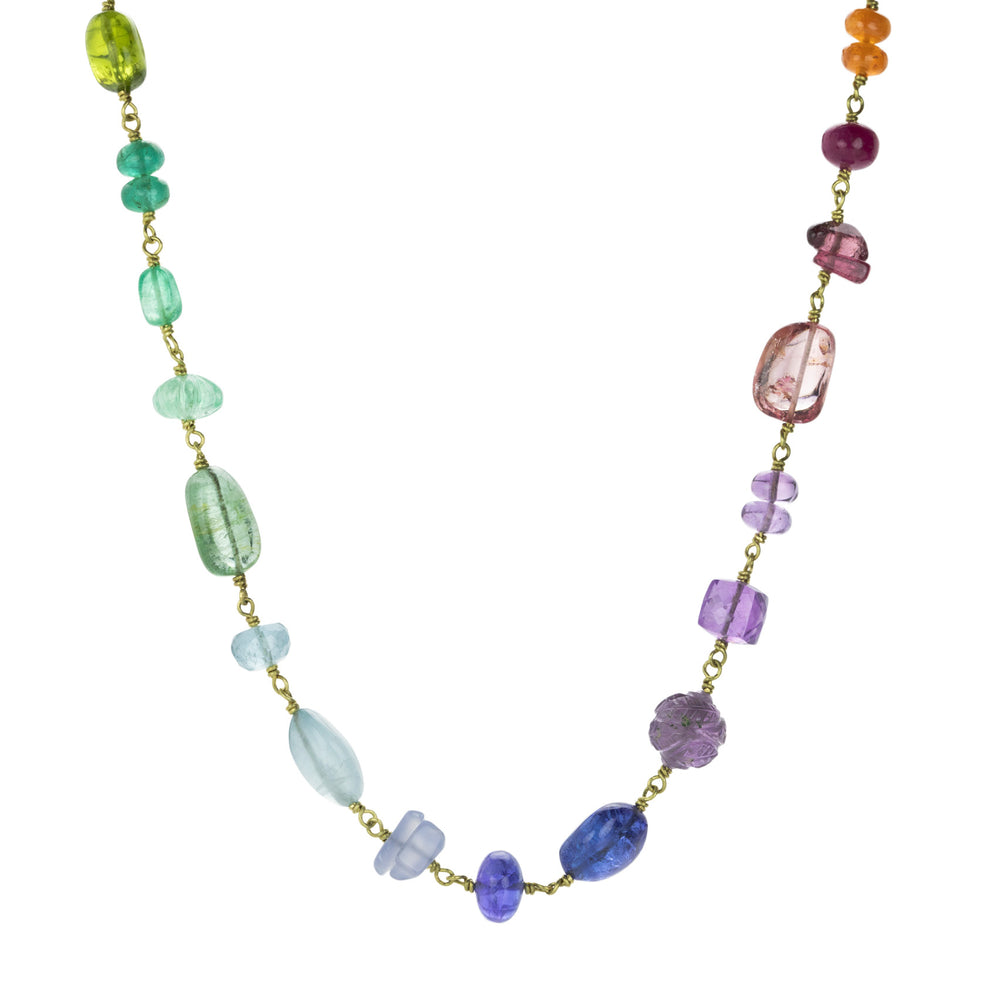 Wear the magic of the rainbow! This absolutely luscious 18k yellow gold spun sugar necklace from Mallary Marks covers all the bases with a fun, luxurious style. Smoky quartz, rutilated quartz, prehnite, chrysoberyl, peridot, emerald, tourmaline, aquamarine, chalcedony, tanzanite, amethyst, ruby, mandarin garnet, spessartite garnet, Ethiopian opal, and American opal beads are carefully arranged and hand wrapped for a lovely drape. Total length measures 18” with a locking hook clasp. Handcrafted in New York, NY, U.S.