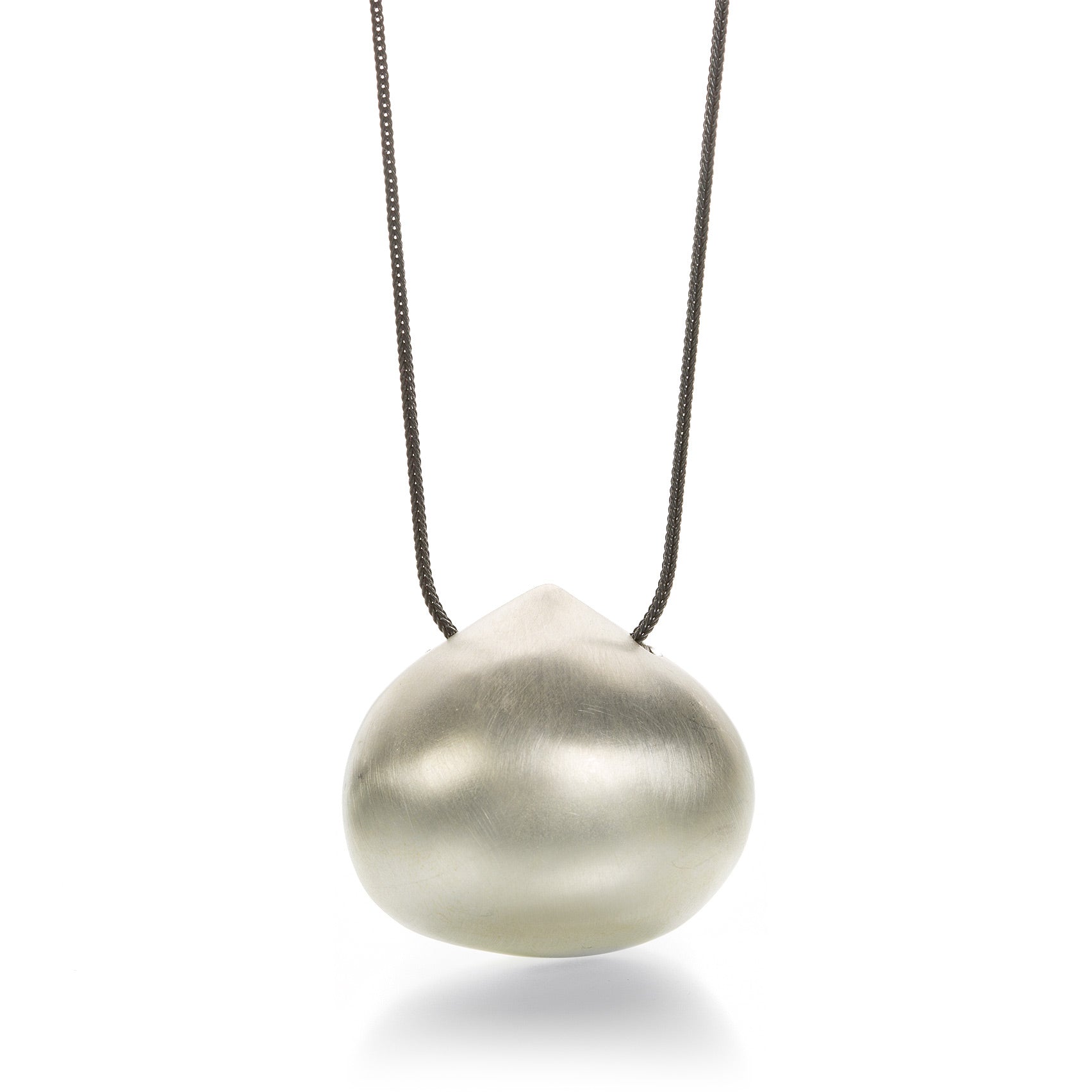 This Gabriella Kiss necklace features a sliding brushed sterling silver chestnut pendant that is all at once earthy and elegant. Strung on an oxidized sterling silver chain, this a a great layering piece. Or, wear it solo to make a singular statement. No matter how you wear it - it's purely gorgeous! Pendant measures approximately 3/4" x 3/4”. Chain length measures 30". Handcrafted in Hudson Valley, NY, U.S.
