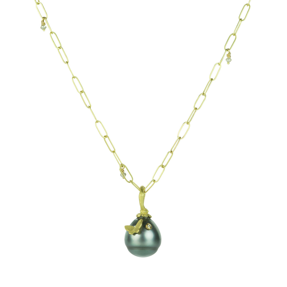 Add a dash of golden whimsy to your daily menu in this 18k yellow gold pendant from Lene Vibe. A dark and mysterious drop shaped Tahitian pearl is held on a hand carved bail, and is home to a delicate butterfly and a 0.01ct bezel set white diamond. Pendant length measures 7/8“. Pendant only, chain is sold separately. Handcrafted in Denmark.