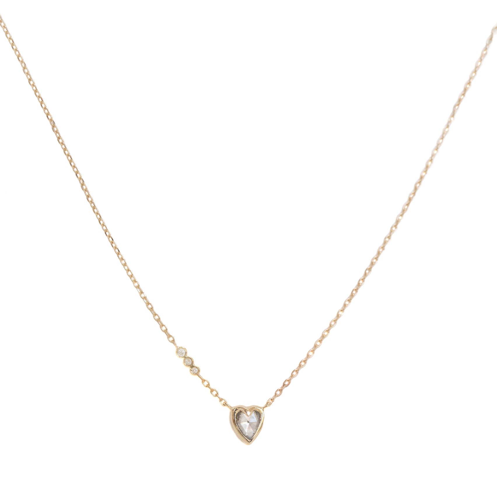 A 14k yellow gold chain with three bezel set diamonds and a heart shaped, rose cut heart shaped diamond pendant. Pendant measures 1/4" on a 15" -16" chain. Handcrafted in Belgium.