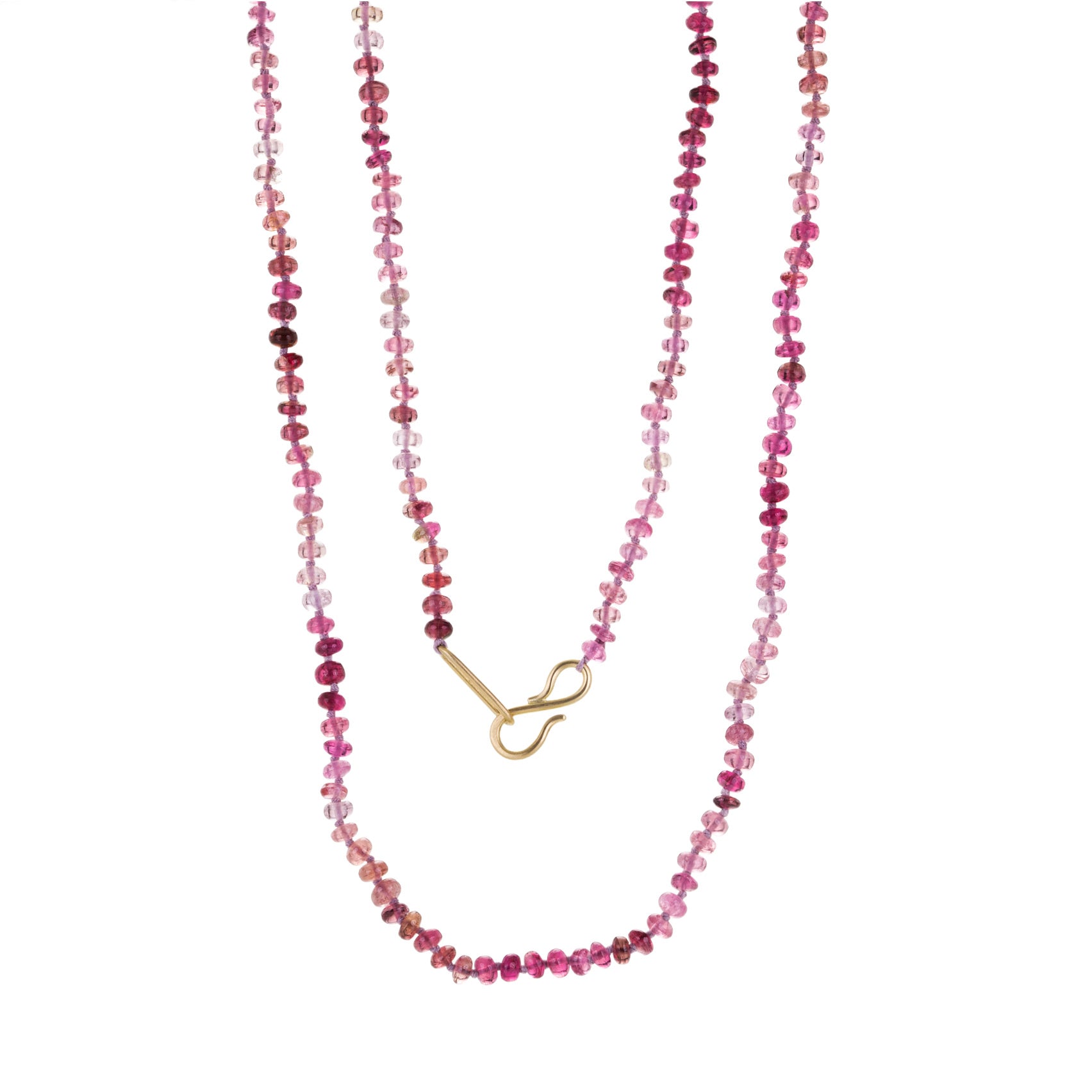 Carefully selected ombre pink tourmaline beads comprise this hand tied necklace from Maria Beaulieu, rich in movement and depth. Layer a drape of deep gemstone color into your look! Knotted on pink silk cord with an 18k yellow gold s-hook clasp, the total length measures 28 1/2”. Handcrafted in Brooklyn, NY, U.S.