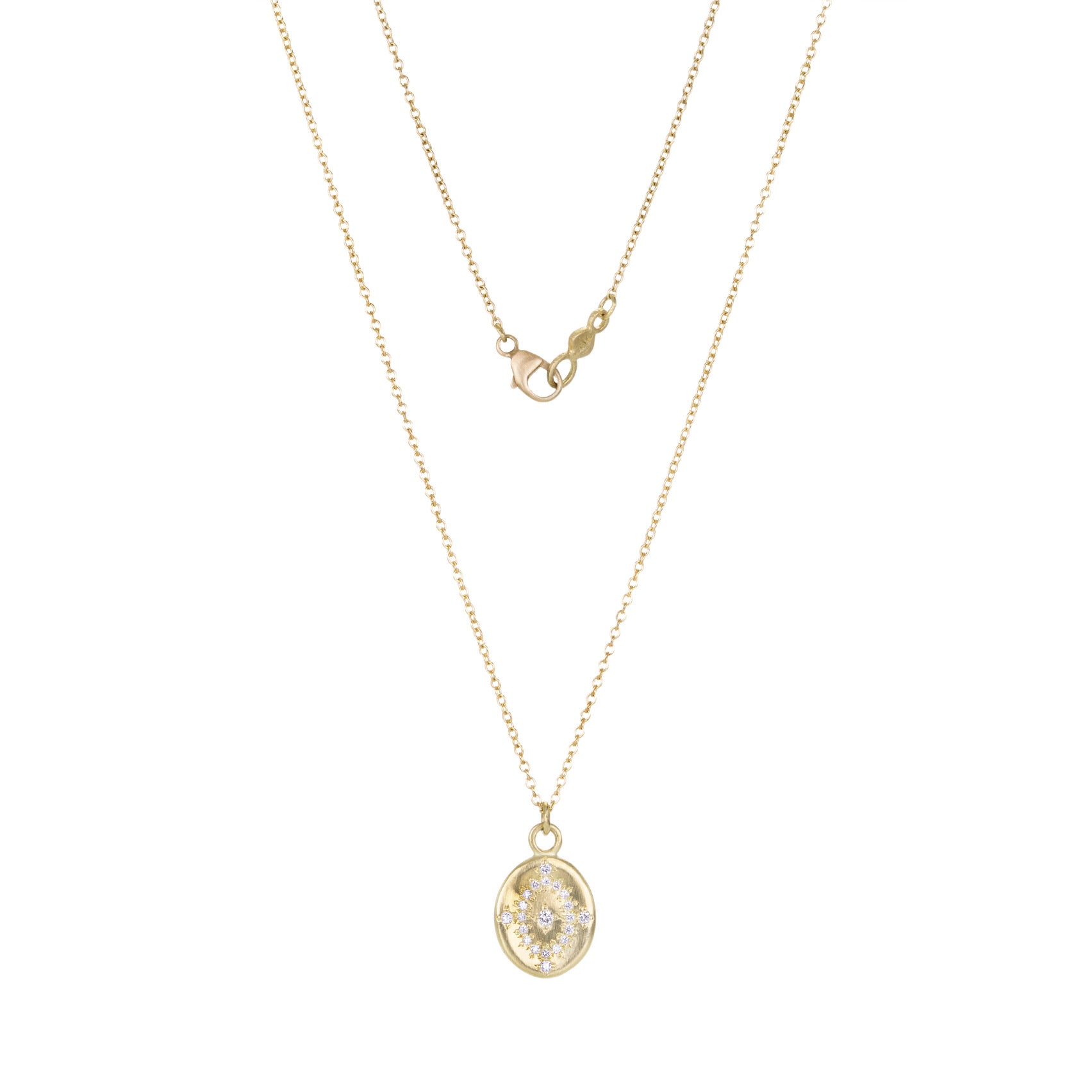 An 18k yellow gold chain with an oval pendant set with white diamonds totaling 0.11ct. Pendant measures 5/8" on a 16" chain. Handcrafted in Rhinebeck, NY, U.S.