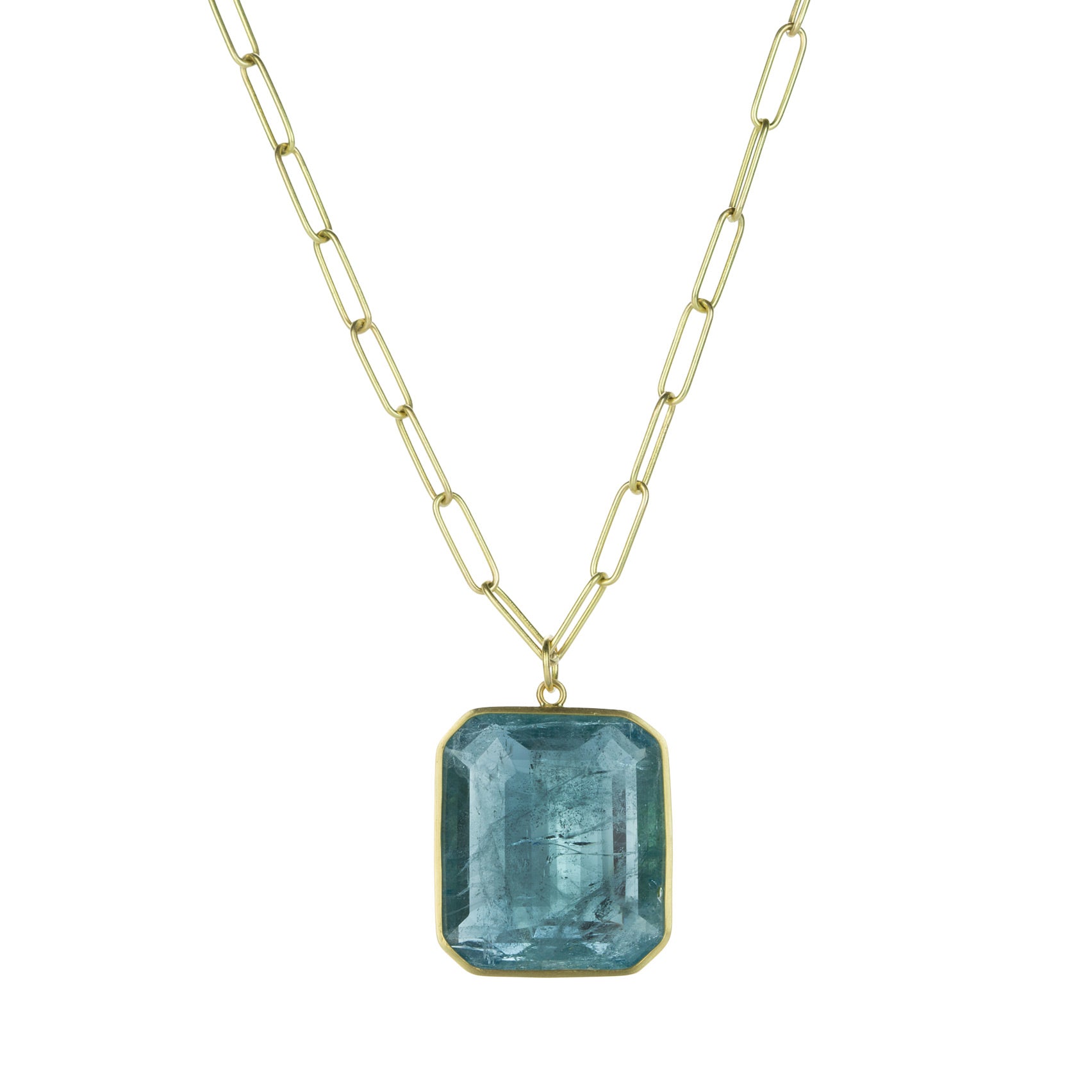 Stay cool to the core in this 18k yellow gold dark aquamarine pendant from Maria Beaulieu. The emerald cut stone sparkles and holds the light like deep glacial ice. Pair it with one of Maria's coveted handmade gold chains to complete the designer look! Stone measures 23mm x 26mm. Total length measures 1 1/4" including bail. Chain is sold separately. Handcrafted in Brooklyn, NY, U.S.