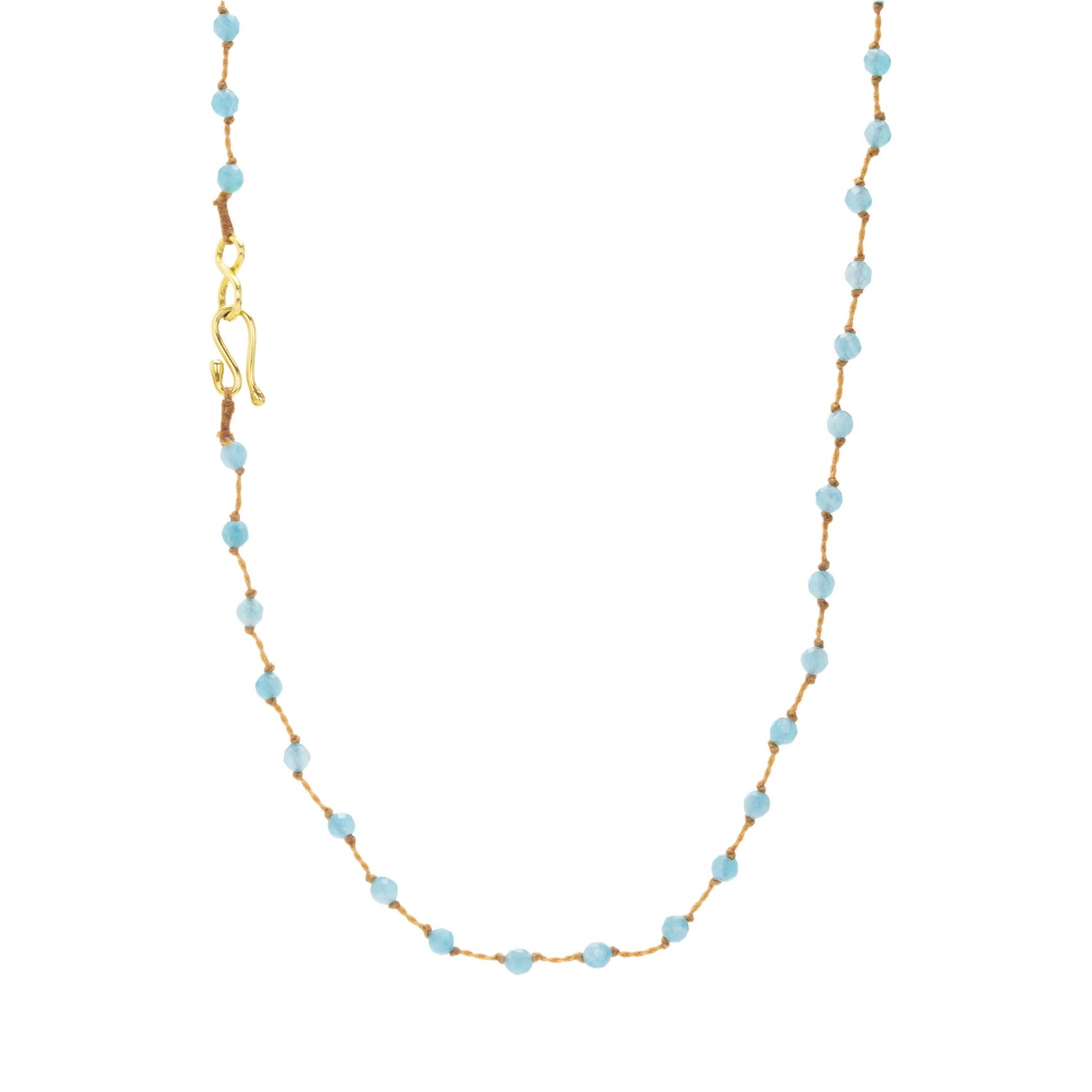 Infuse a layer of luscious gemstone sparkle to look with this simply elegant beaded necklace from Lena Skadegard. Faceted amazonite beads seem to find the light in an airy, hand knotted array. Total length with a 9k yellow gold hook clasp measures 18". Handcrafted in India.