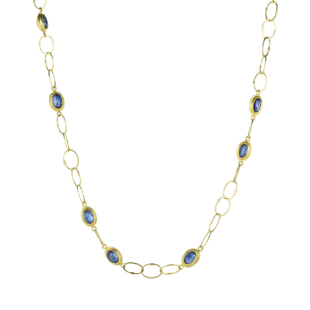 Airy and luxurious with a handcrafted touch, this 18k yellow gold textured oval link chain necklace from Petra Class is a vibrant addition to your neck party! With stations of double sided 22k yellow gold bezel set faceted blue sapphires, layer it up or wear it alone for a soft, subtle statement. Total length with hook clasp measures 18". Handcrafted in San Francisco, CA, U.S.