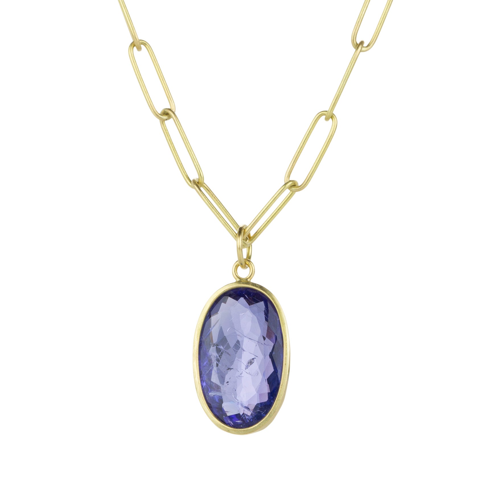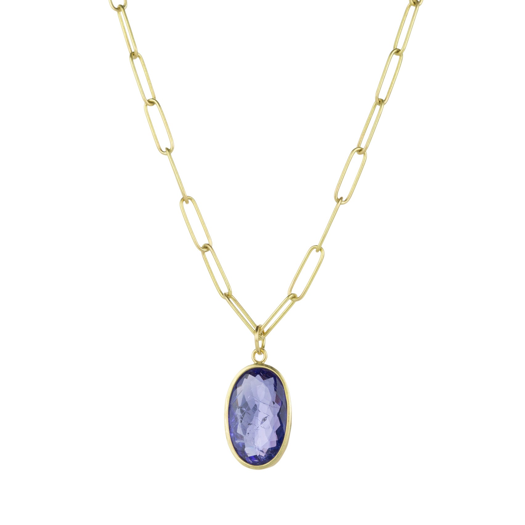 Feel into a new twist on the blues in the the unmistakable hue of rare tanzanite! This 18k yellow gold pendant from Maria Beaulieu features a faceted 12x20mm violet blue tanzanite, set simply in a thin gold bezel to let its natural beauty shine. Pair it with one of the artist’s coveted handmade chains to complete the designer look. Pendant length measures just over 1” including the bail. Chain is sold separately. Handcrafted in Brooklyn, NY, U.S.