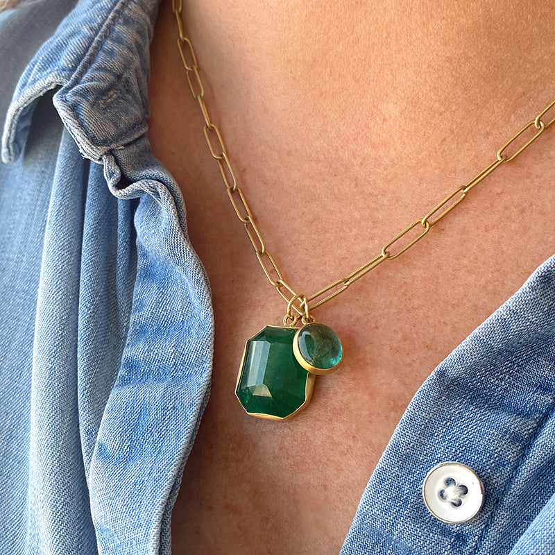 This brilliant 14.5ct fancy emerald pendant from Maria Beaulieu will refresh your style and senses. Set simply in an 18k yellow gold bezel to let the stone do the talking, this statement maker is sure to infuse a rush of energy. Pair it with one of the artist’s coveted handmade chains to complete the designer look. Emerald measures 16mm x 19mm. Pendant measures 1“ in length including bail. Pendant only, chain is sold separately. Handcrafted in Brooklyn, NY, U.S.
