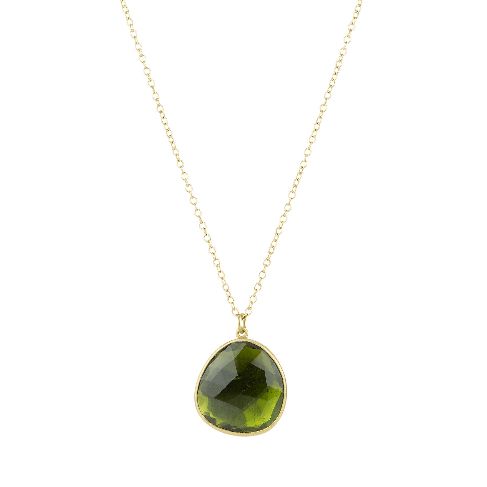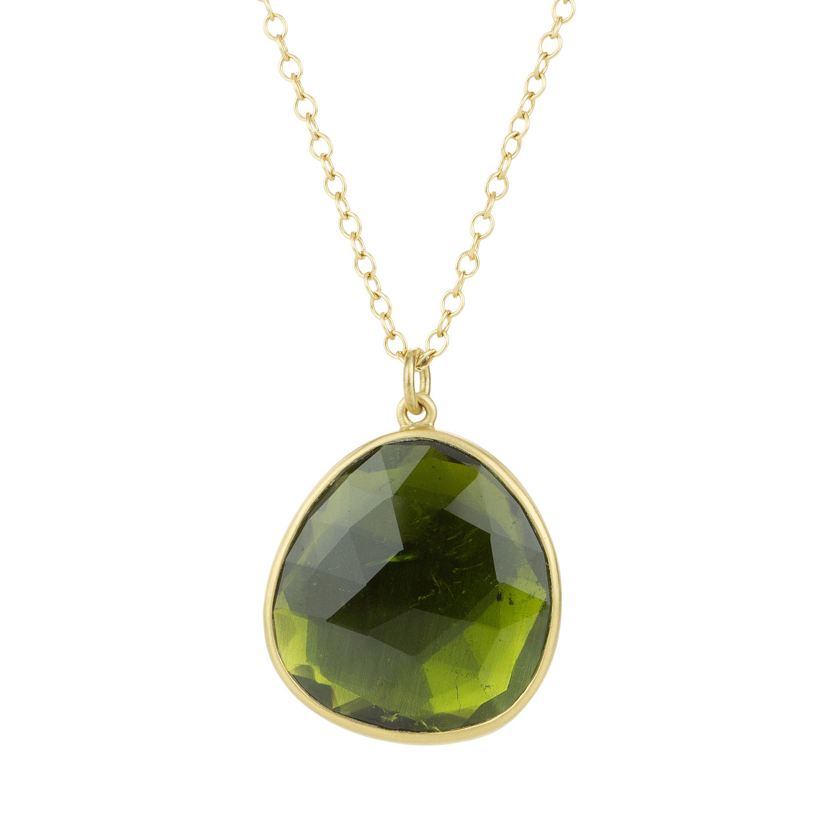 Rich, natural color steals the show in this 18k yellow gold necklace from Lola Brooks, featuring a freeform, faceted 11.75ct green tourmaline pendant. The simplicity of the brushed gold bezel lets the stone send its energy far and wide. Pendant measures 1" in total length, including bail. Total cable chain length with lobster clasp measures 18”. Handcrafted in Lexington, GA, U.S.