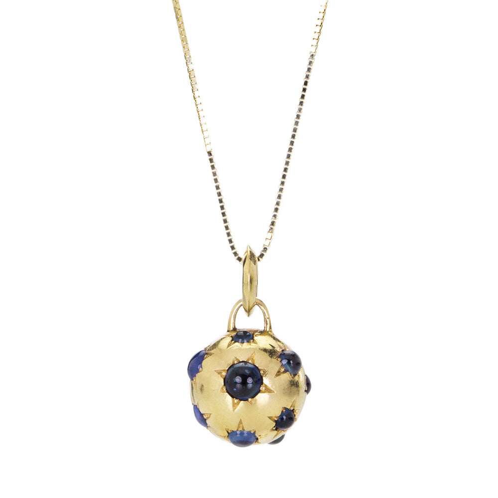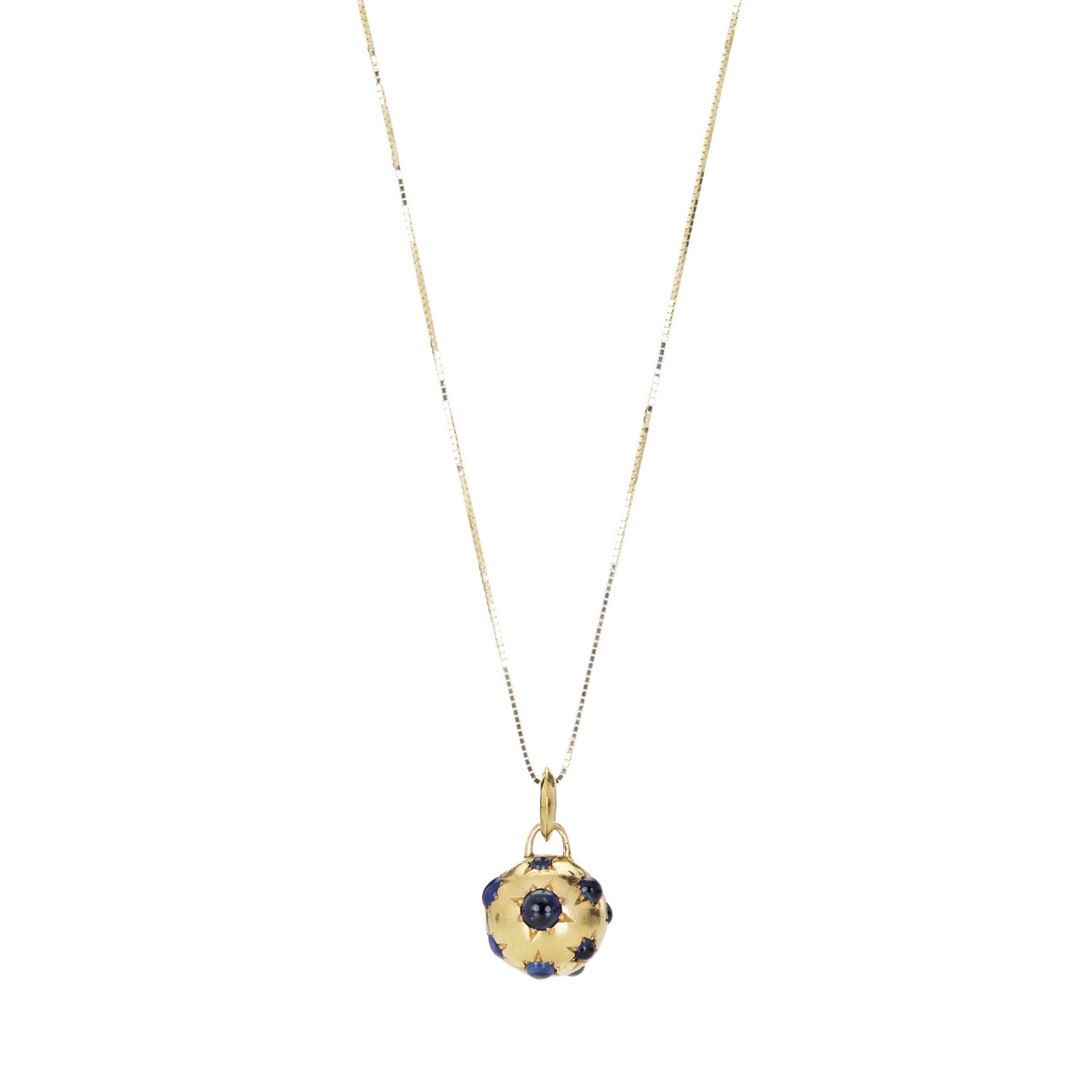 Immerse yourself in the blues in this 18k yellow gold orb charm from Tamsin Rasor. This dazzling pendant features an assortment of blue sapphire cabochons, set all throughout the surface with starry textural detail. An elegant knife edge bail holds this fun piece! Charm length measures 5/8" including the bail. Charm only, chain is sold separately. Handcrafted in New York, NY, U.S.