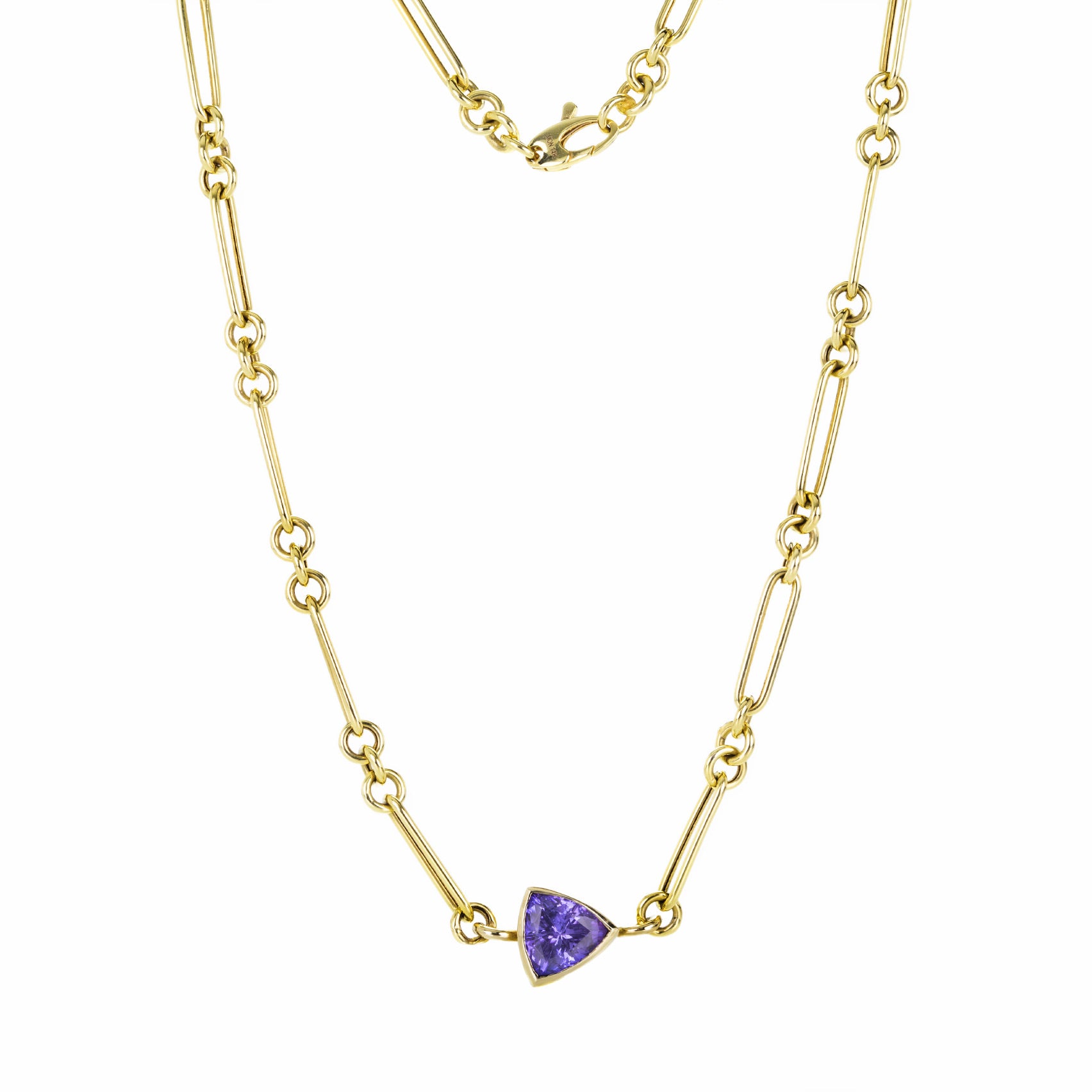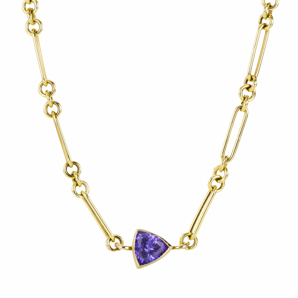 A highly unique marriage of color and form sets this 14k yellow gold necklace from Fannie Thomas apart from the rest. A mix link chain holds a bezel set, trillion cut 3.41ct deep blue tanzanite. Necklace measures 19” with lobster clasp. Handcrafted in San Antonio, TX, U.S.