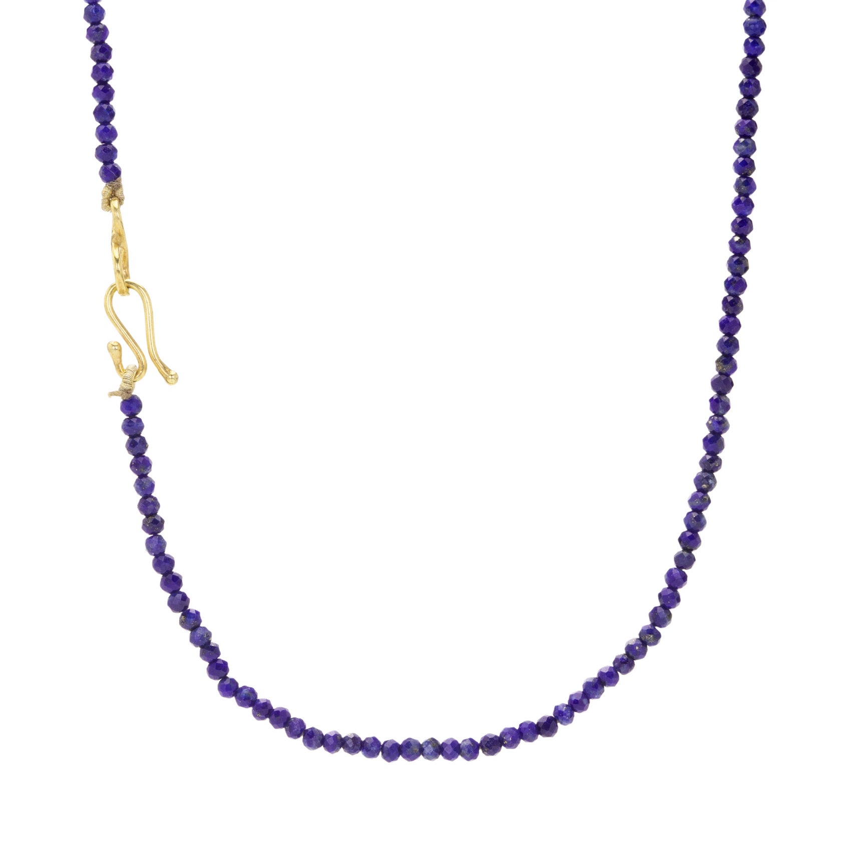 This sparkly beaded necklace from Lena Skadegard adds a splash of color to your layered look, or stands alone as a soft, simple statement. Faceted lapis beads are set off by a gleaming 9k yellow gold hook and eye clasp. Total length measures 16 1/2“. Handcrafted in India.