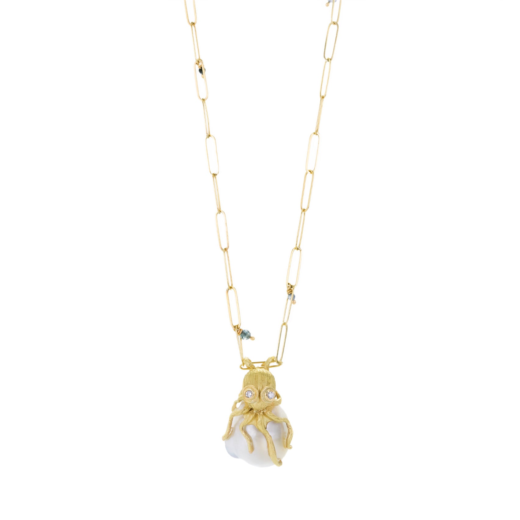 Satisfy your curiosity for the unique with a dazzling underwater display! This 18k yellow gold pendant from Lene Vibe pays homage to the one and only octopus, meticulously carved with sparkling bezel set diamond eyes totaling 0.06cttw. A wonderfully unique white South Sea pearl gracefully holds the creature. Pendant measures approximately 1" in total length. Handcrafted in Denmark.