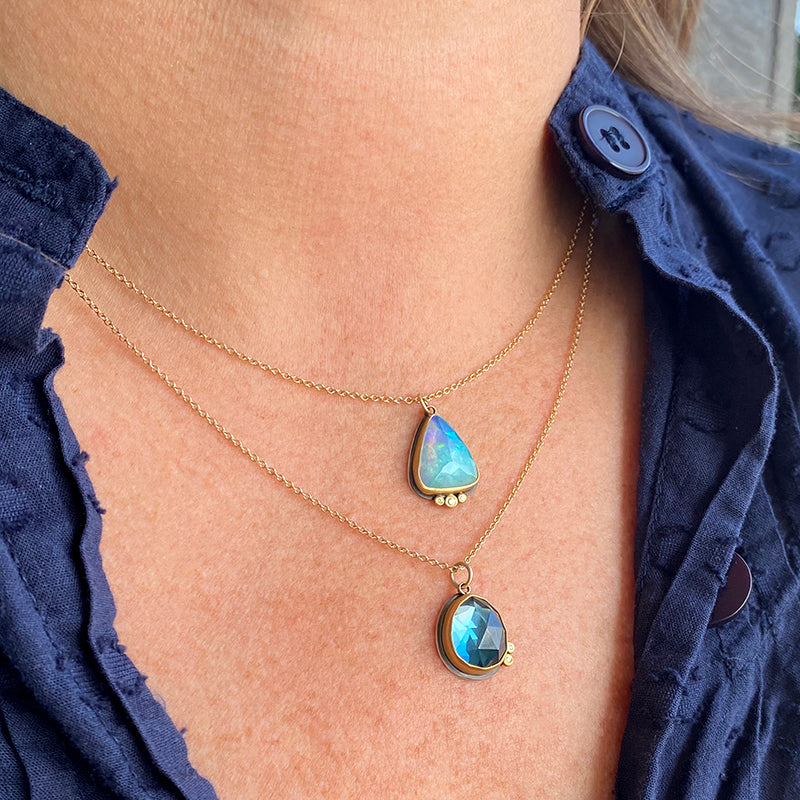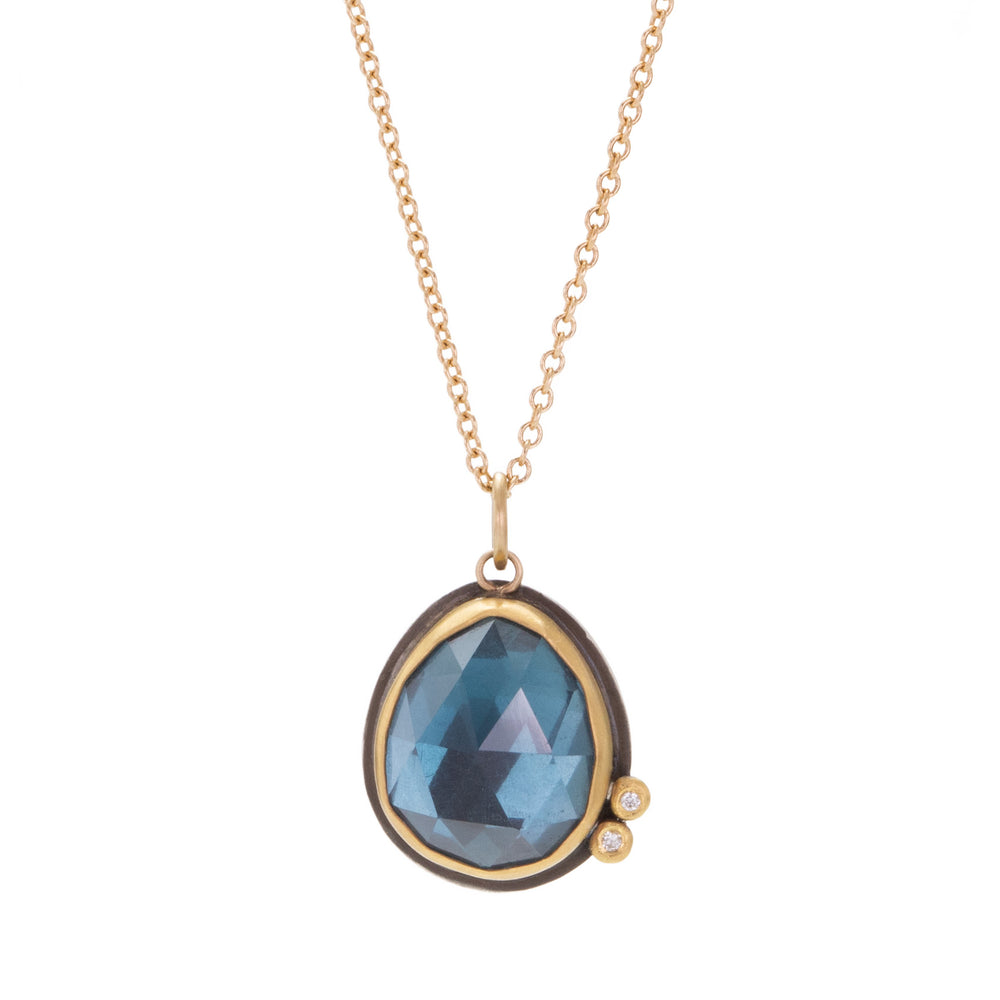 Bathe your soul in the blues with this organically elegant pendant necklace from Ananda Khalsa. A 14k yellow gold chain holds a rose cut London blue topaz pendant set in a 22k yellow gold bezel with sterling silver backing. Two small bezel set diamonds accent the stone. Pendant measures just under 3/4" in length, including bail. Chain length with lobster clasp measures 16”. Handcrafted in Northampton, MA, U.S.