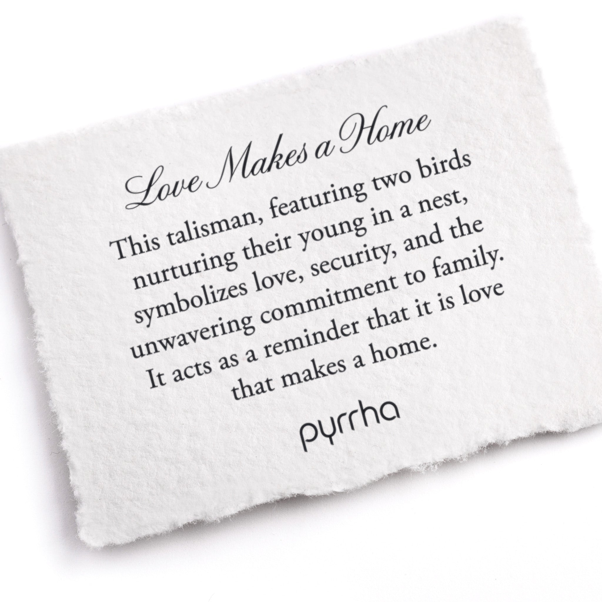 Two birds nurturing their young in a nest in this Pyrrha pendant are symbolic of love, security, and the unwavering commitment to family. It acts as a reminder that it is love that makes a home. Lovingly and sustainably cast in recycled sterling silver with a layer of purple ceramic, this potent talisman hangs on a 22" fine cable chain with lobster clasp. Consider adding a Pyrrha attraction charm to this piece for an extra layer of color and meaning. Handcrafted in Vancouver, Canada.