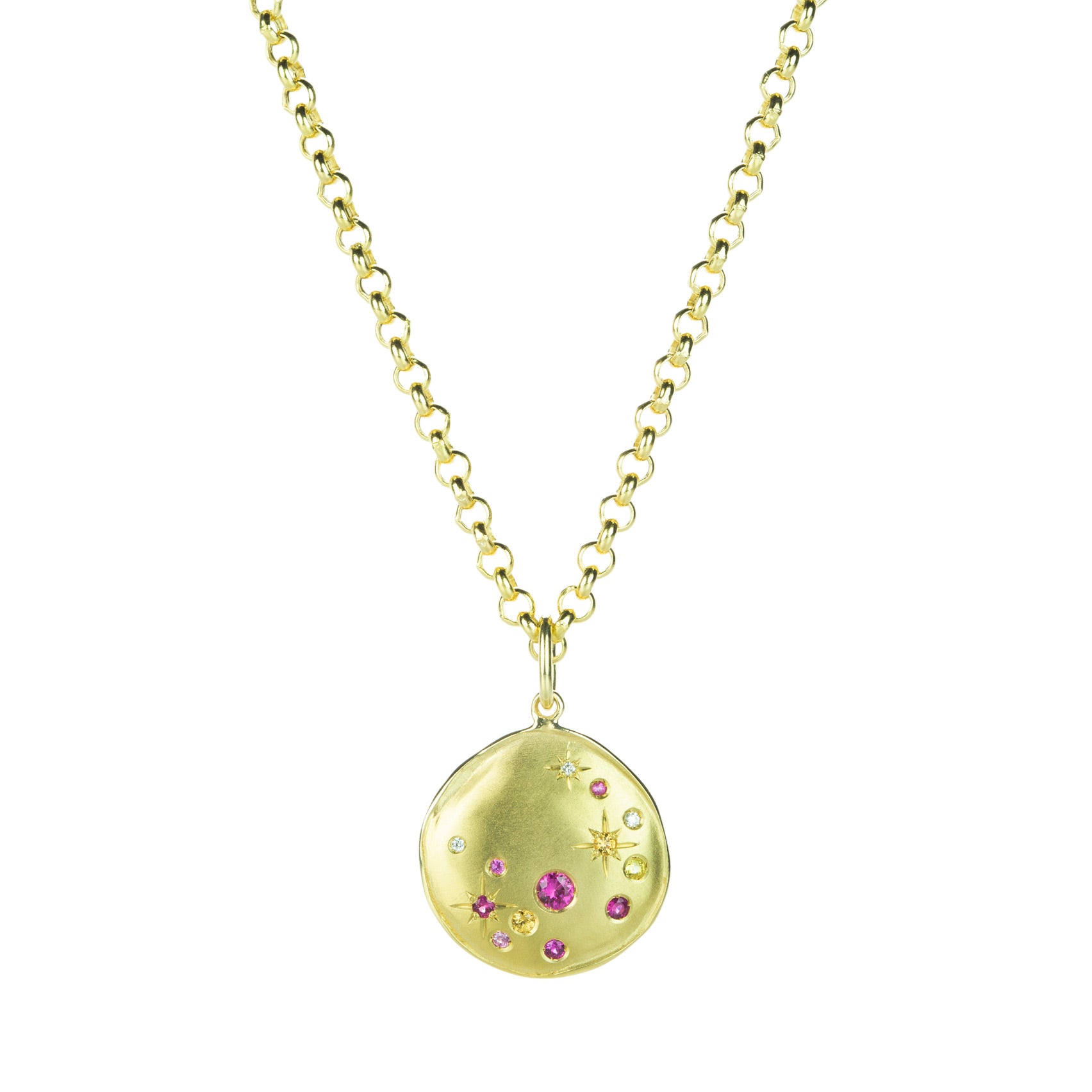Let the joy of sunshine light up your soul in this 18k yellow gold necklace from Anne Sportun! An organic coin pendant features starry patterns with multicolored surface set sapphires. Perfect for layering or as a solo piece! Pendant measures 1" x 5/8”. Rolo chain length measures 18". Handcrafted in Toronto, ON, Canada.