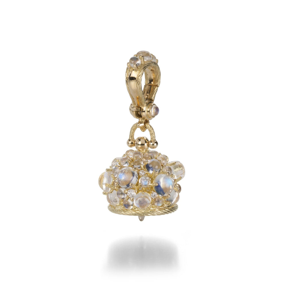 This glowing meditation bell from Paul Morelli will help slip you into a peaceful state of being. Each Morelli bell has a unique tone all to itself, like each of us. Modeled in 18k yellow gold and encrusted in cabochon moonstones totaling 4.60cttw, the bell is dotted with diamonds totaling 0.15cttw for a touch of magical sparkle. The bell hangs from an expertly crafted lanyard hook. Chain is sold separately. Pendant measures 1 1/4” in total length. Handcrafted in Philadelphia, PA, U.S.