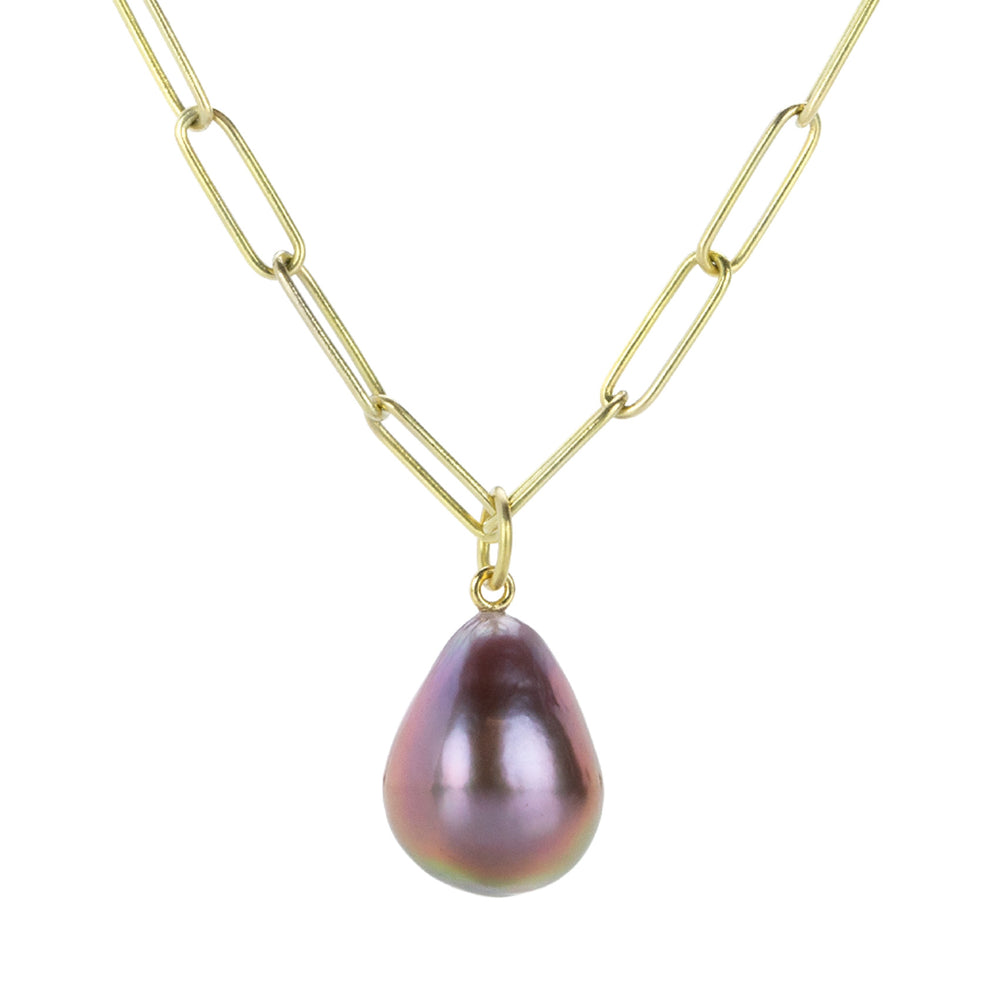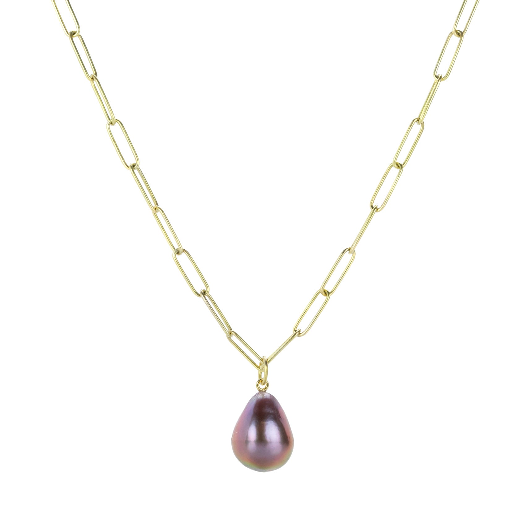 Soft and serene, this Maria Beaulieu piece is a perfect reflection of your gentle soul. Straight from the heart of the sea to yours, the 18k yellow gold pendant features a 12mm x 16mm metallic purple baroque freshwater pearl. Total length measures 7/8“. Pair it with one of the artist’s coveted handmade chains to complete the designer look. Chain sold separately. Handcrafted in Brooklyn, NY, U.S.