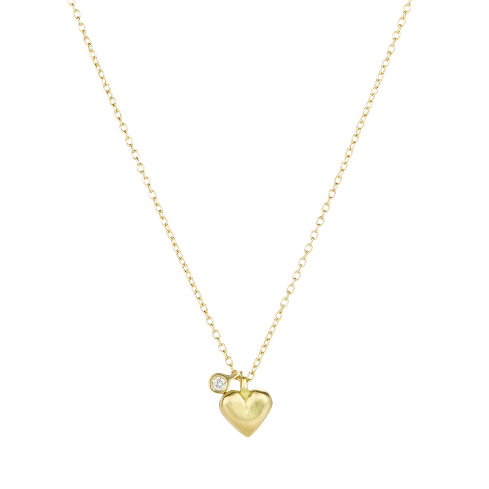 Let your sparkling heart shine in this charmed 18k yellow gold necklace from Marian Maurer! A micro heart pendant and a 0.02ct bezel set white diamond hang on a fine cable chain, perfect for layering or as a sweet, simple declaration of love. Heart pendant measures 1/4" in diameter. Toral chain length with lobster clasp measures 16”. Handcrafted in Brooklyn, NY, U.S.
