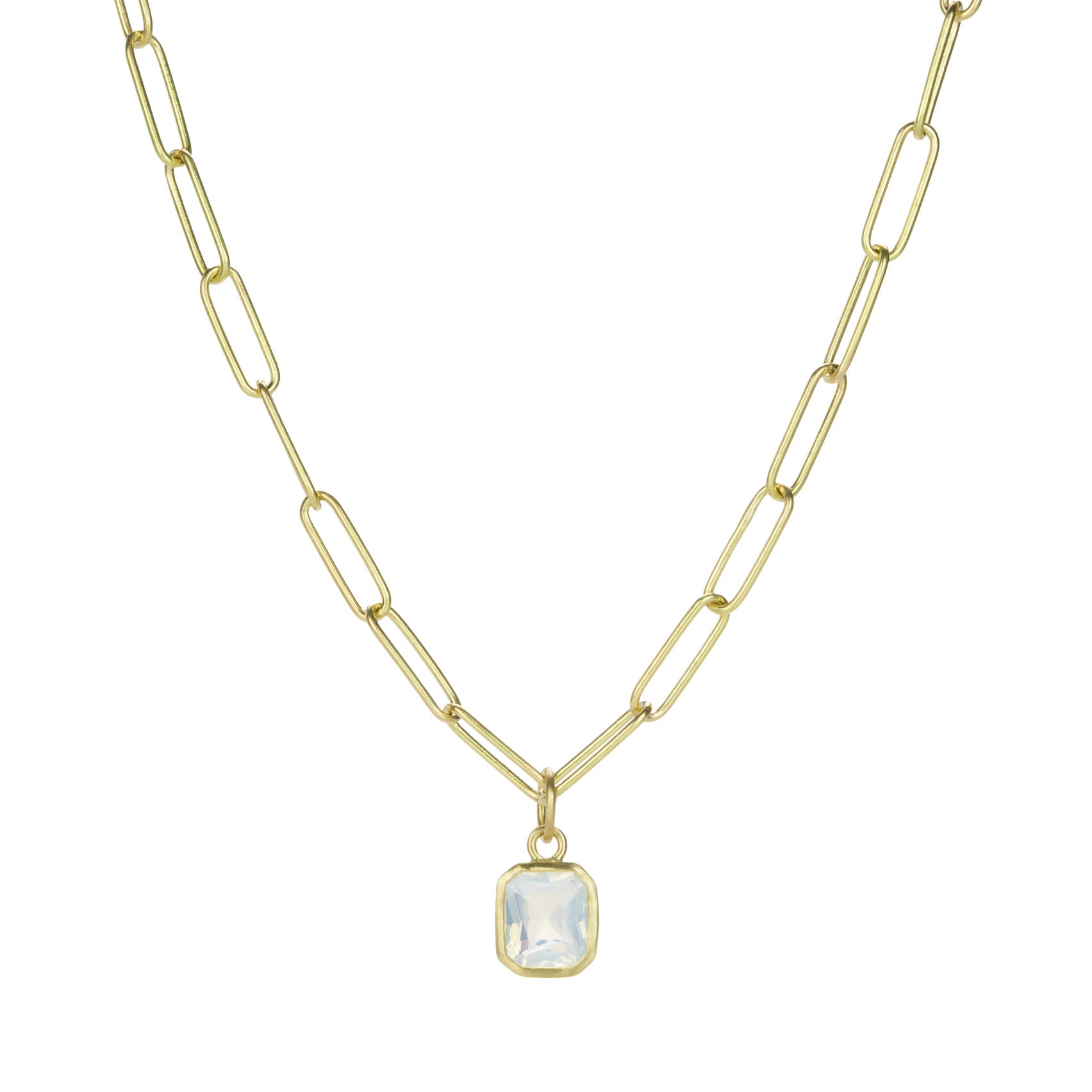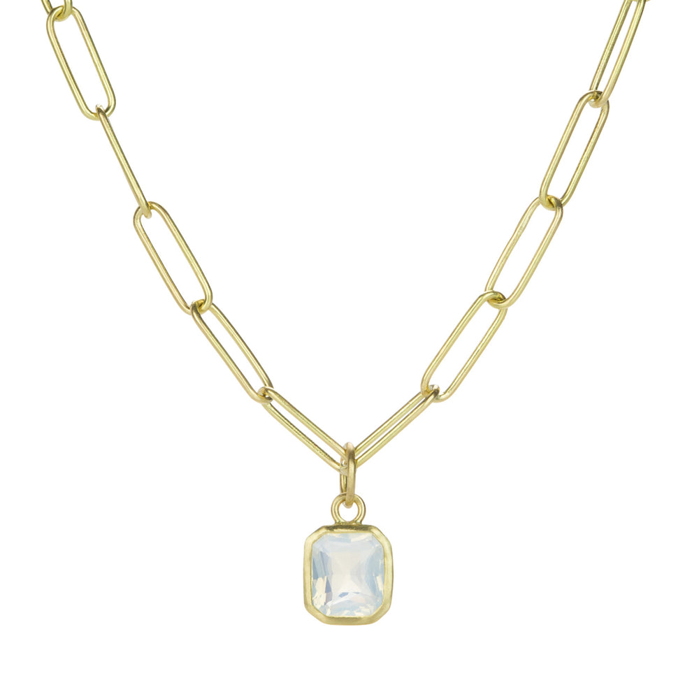Versatile and sophisticated, this 18k yellow gold pendant from Maria Beaulieu features a mini emerald cut moonstone with flashy fires from within. Pair it with one of the artist’s coveted handmade chains to complete the designer look. Moonstone measures 8mm x 9mm. Pendant length measures 5/8" including bail. Chain sold separately. Handcrafted in Brooklyn, NY, U.S.