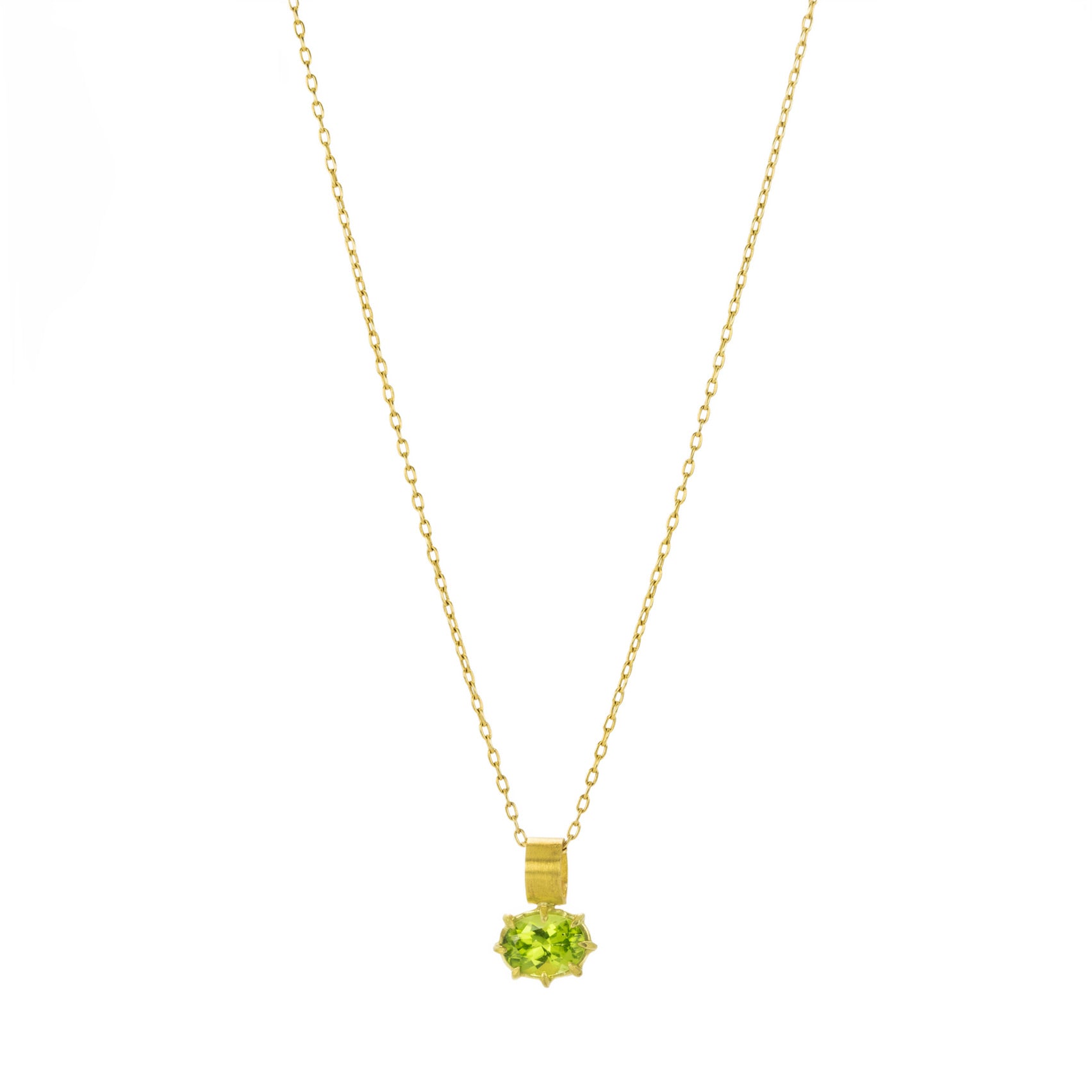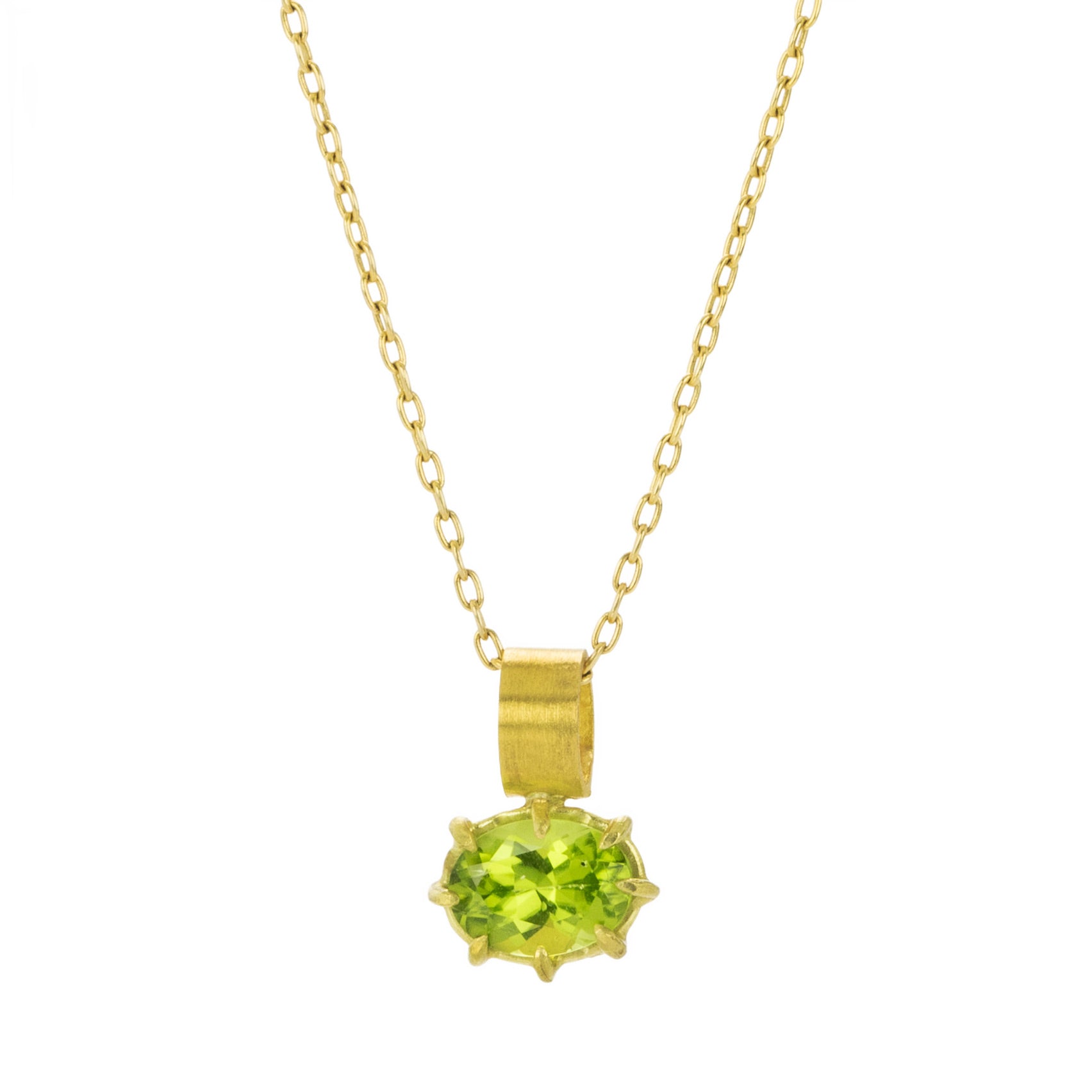 This 18k yellow gold pendant from Rosanne Pugliese is fresh and effervescent in bright, sparkly green. A mini faceted oval peridot is set east-west in pointed prongs with a wide 22k yellow gold brushed bail. Total length measures 1/2" including bail. Pendant only, chain is sold separately. Handcrafted in Brooklyn, NY, U.S.