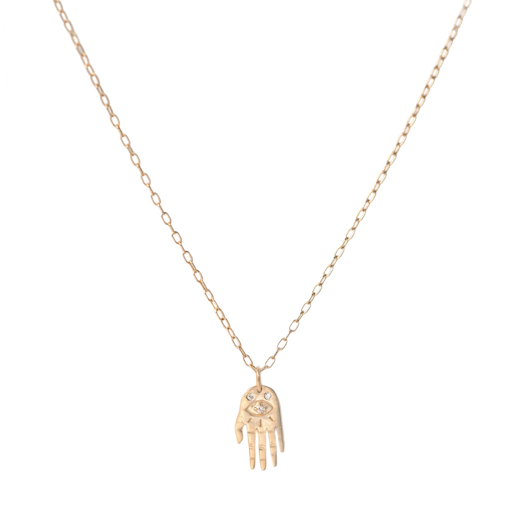 A 14k yellow gold chain with a mini protection hand pendant with a carved eye and diamond accents totaling 0.01ct. Pendant measures 1/2" on a 16.5" chain. Handcrafted in Belgium.