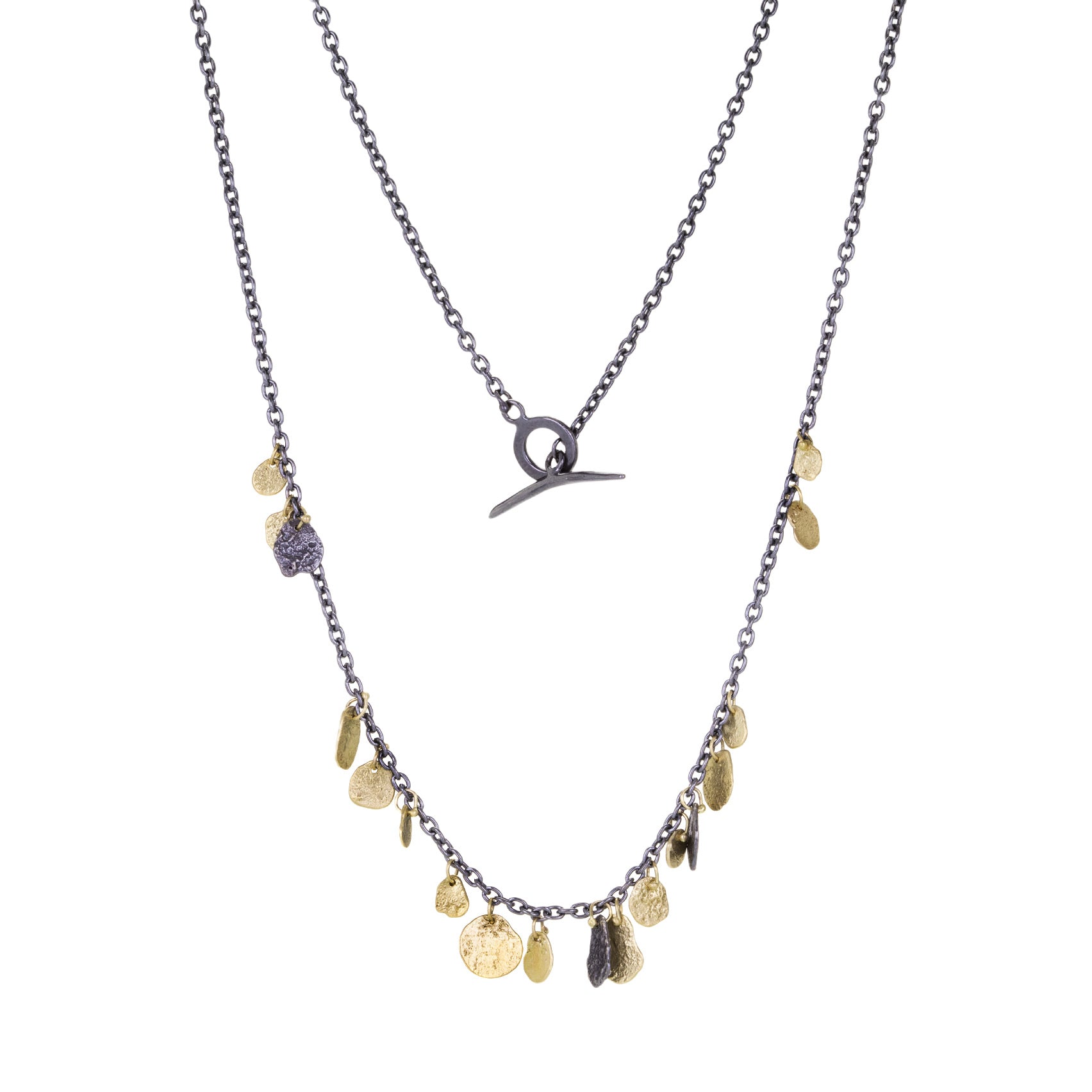 Alive with movement and texture, this 18k yellow gold and oxidized sterling silver necklace from Sarah McGuire keeps things fresh and fun. Organic, hammered mixed gold and silver charms on tiny beaded rings cluster at the center of the chain. Total length with toggle clasp measures 18". Handcrafted in Chicago, IL, U.S.