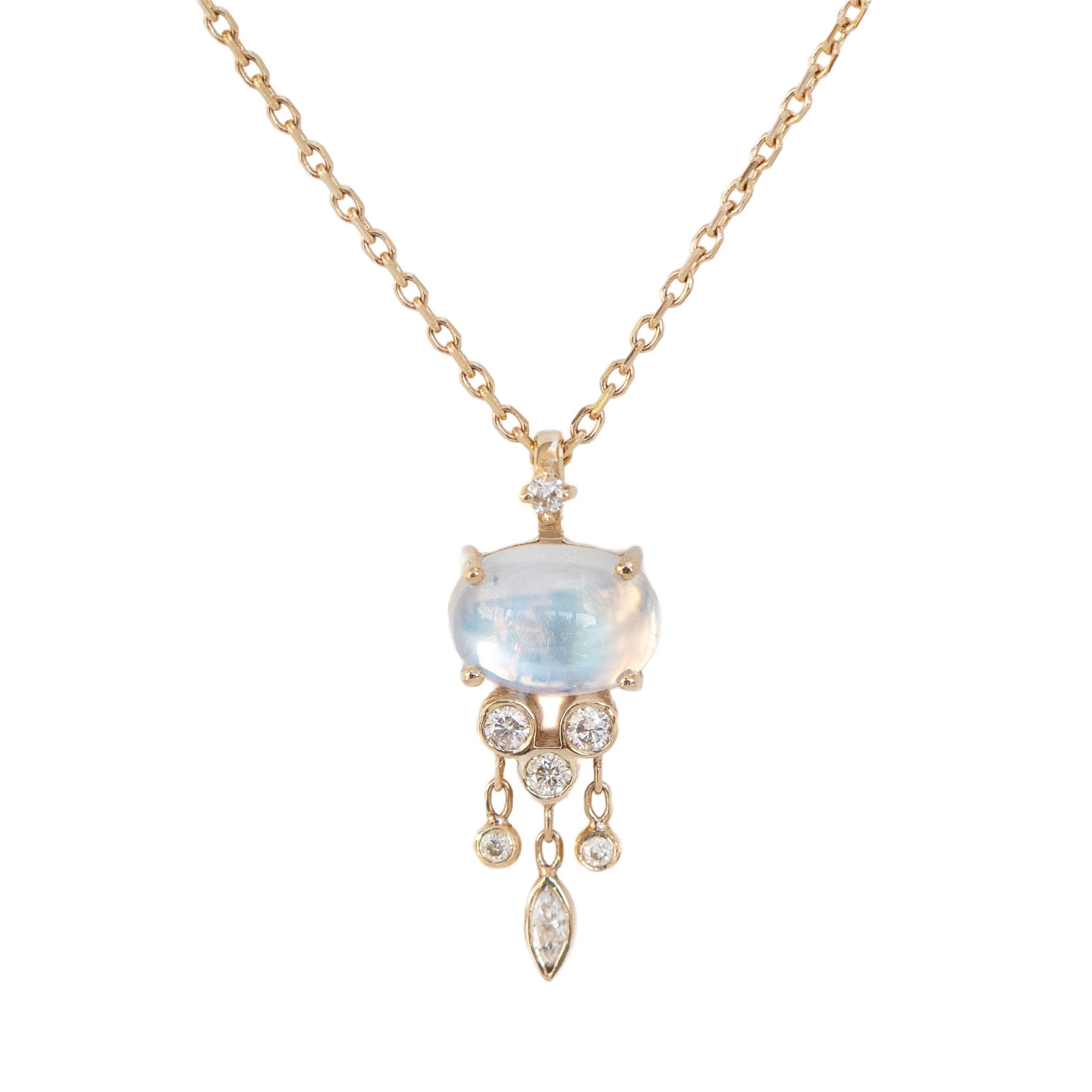 A 14k yellow gold chain with a jellyfish pendant with a prong set, oval moonstone and diamond accents. Pendant measures 3/4" on a 16" chain. Handcrafted in Belgium