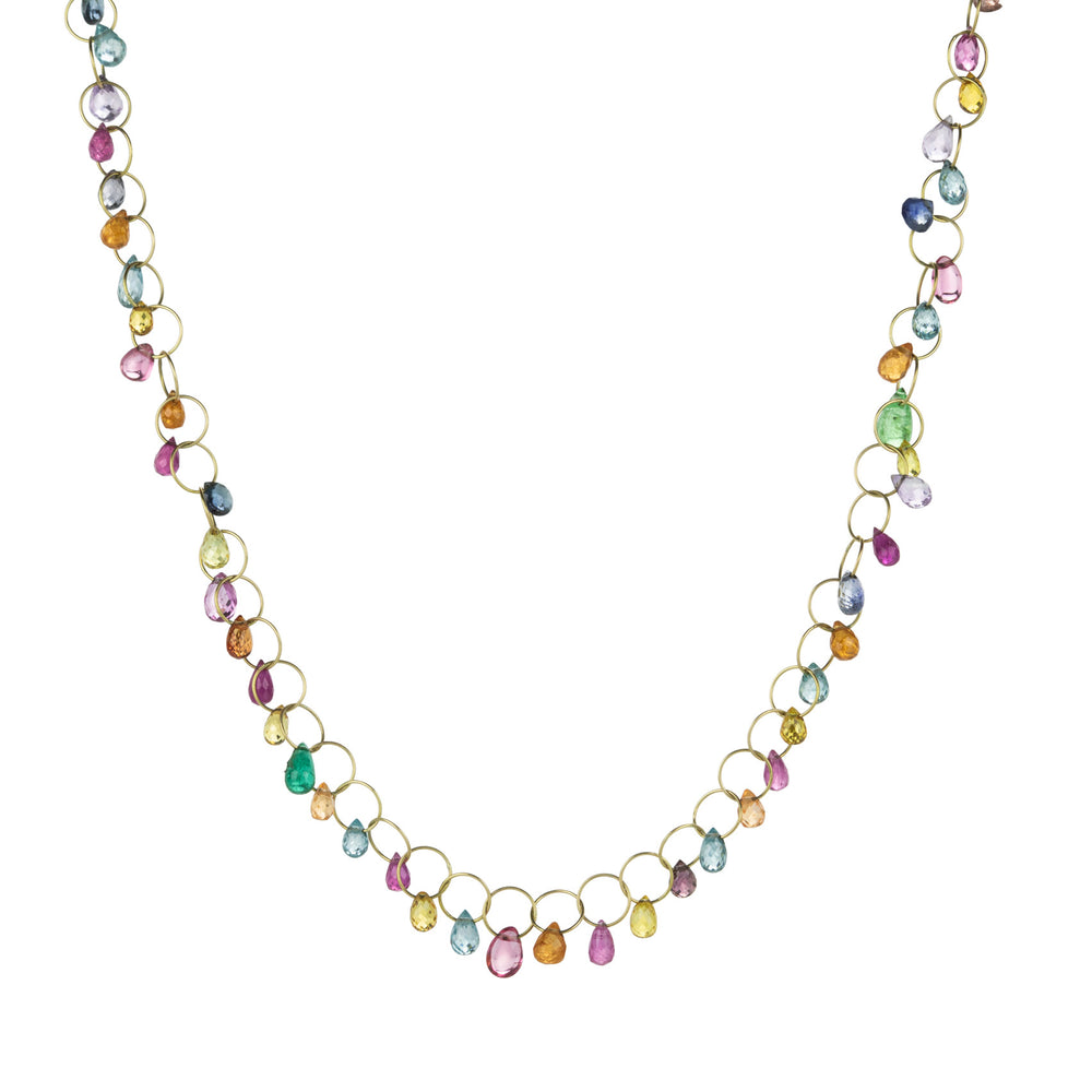 Take the show on the road in this delightful necklace from Mallary Marks! An 18k yellow gold airy link chain holds an vibrant mix of smooth and faceted briolettes, including mandarin garnet, pink tourmaline, light blue zircon, ruby, multicolored sapphire, emerald, tsavorite, aquamarine and amethyst. Total length with spring ring clasp measures 16 3/4“. Handcrafted in New York, NY, U.S.