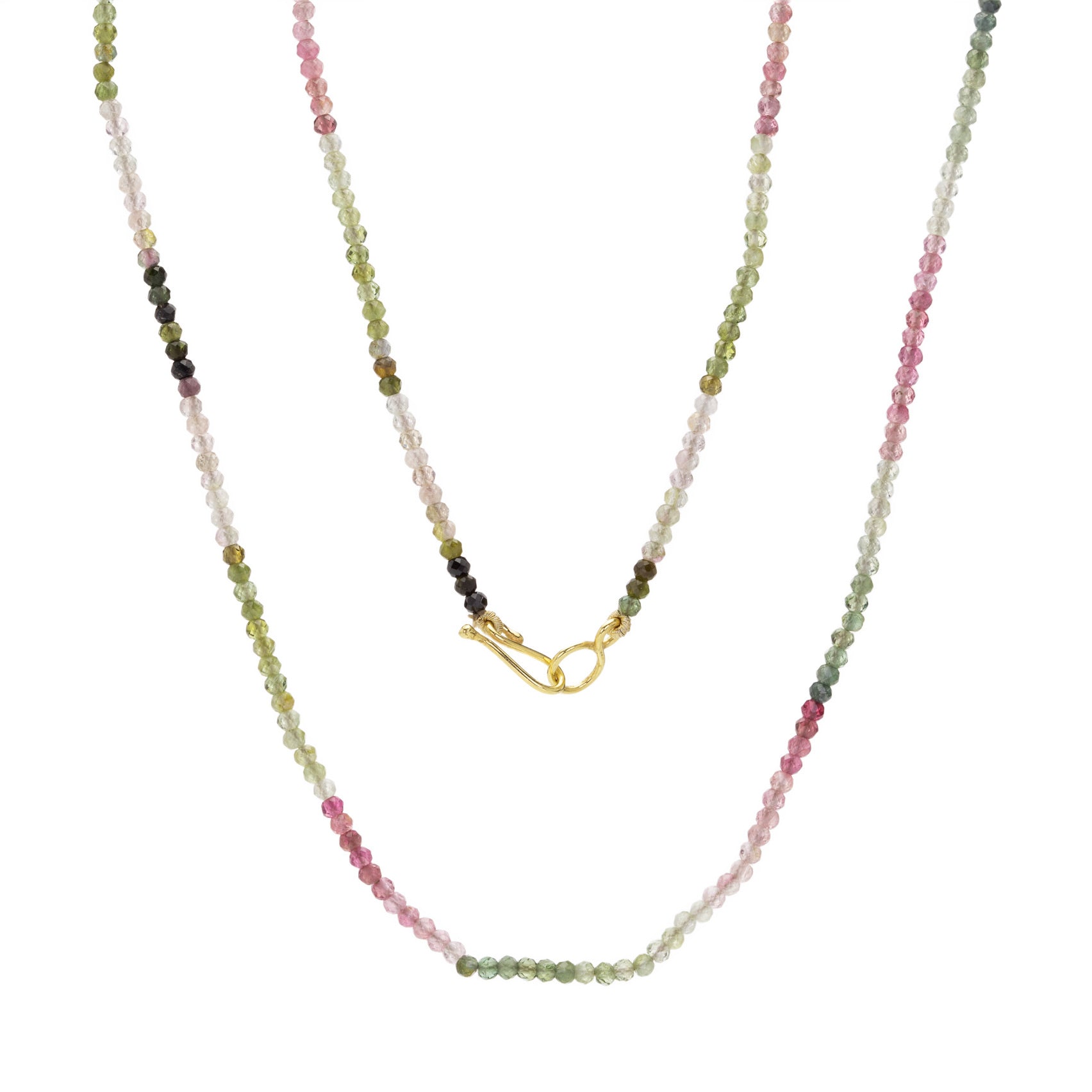 This sparkly beaded necklace from Lena Skadegard adds a splash of color to your layered look, or stands alone as a soft, simple statement. Faceted multicolored tourmaline beads are set off by a gleaming 9k yellow gold hook and eye clasp. Total length measures 32". Handcrafted in India.