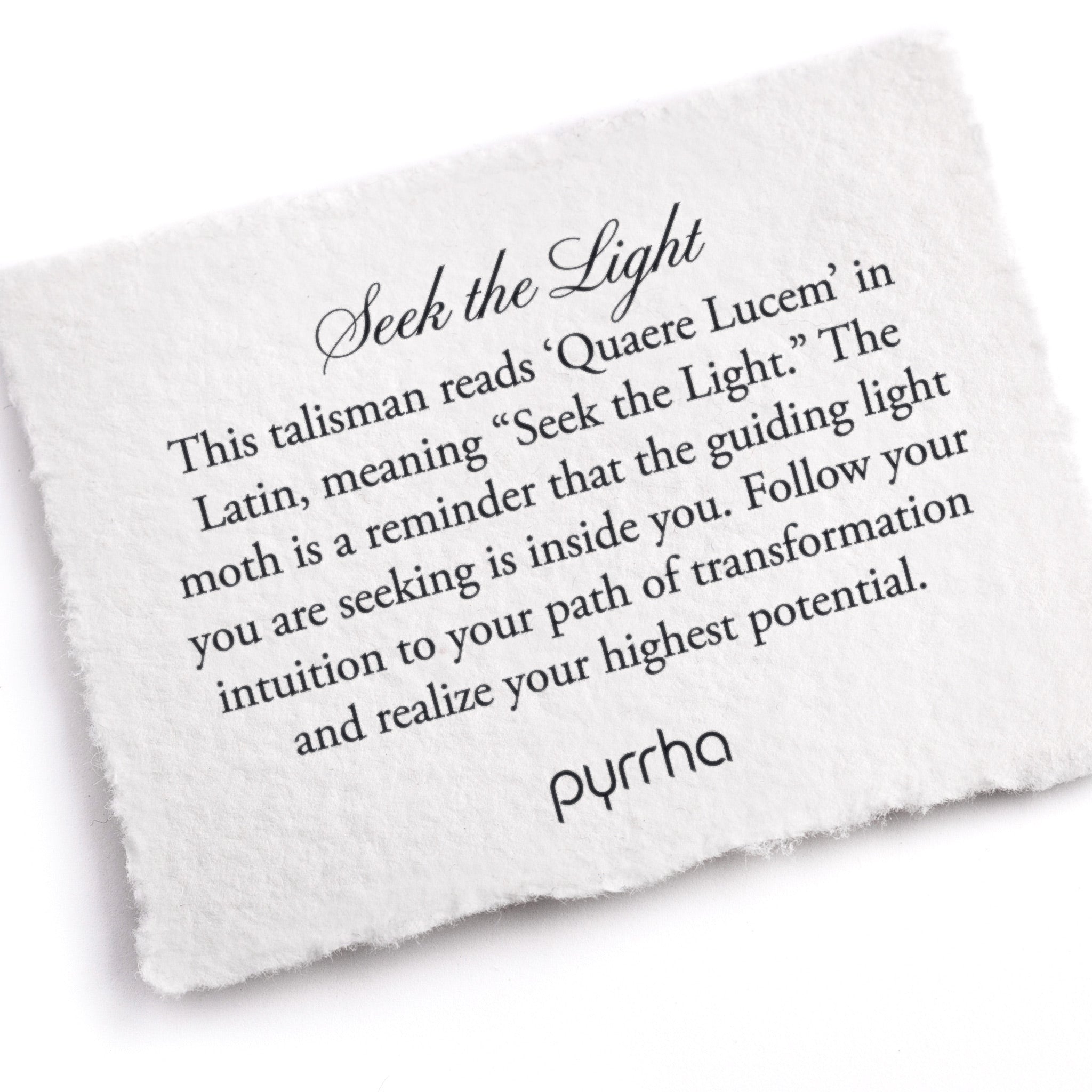 The moth is a reminder that the guiding light you are seeking is inside you. This Pyrrha pendant reads 'Quaere Lucem' in Latin, meaning "Seek the Light." Follow your intuition to your path of transformation and realize your highest potential. Lovingly and sustainably cast in recycled sterling silver with a layer of purple ceramic, this potent talisman hangs on an 18" fine cable chain with lobster clasp. Consider adding a Pyrrha attraction charm to this piece for an extra layer of color and meaning. Handcrafted in Vancouver, Canada.