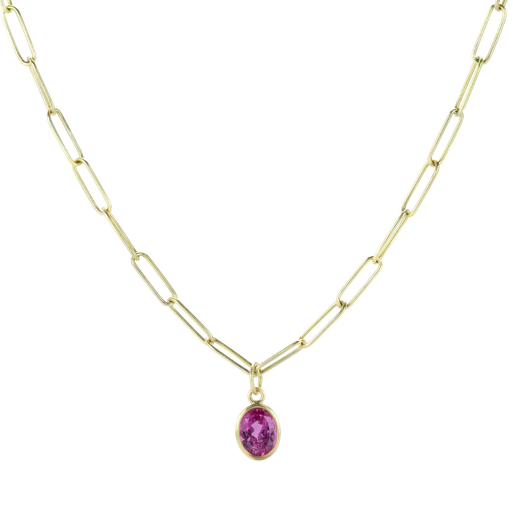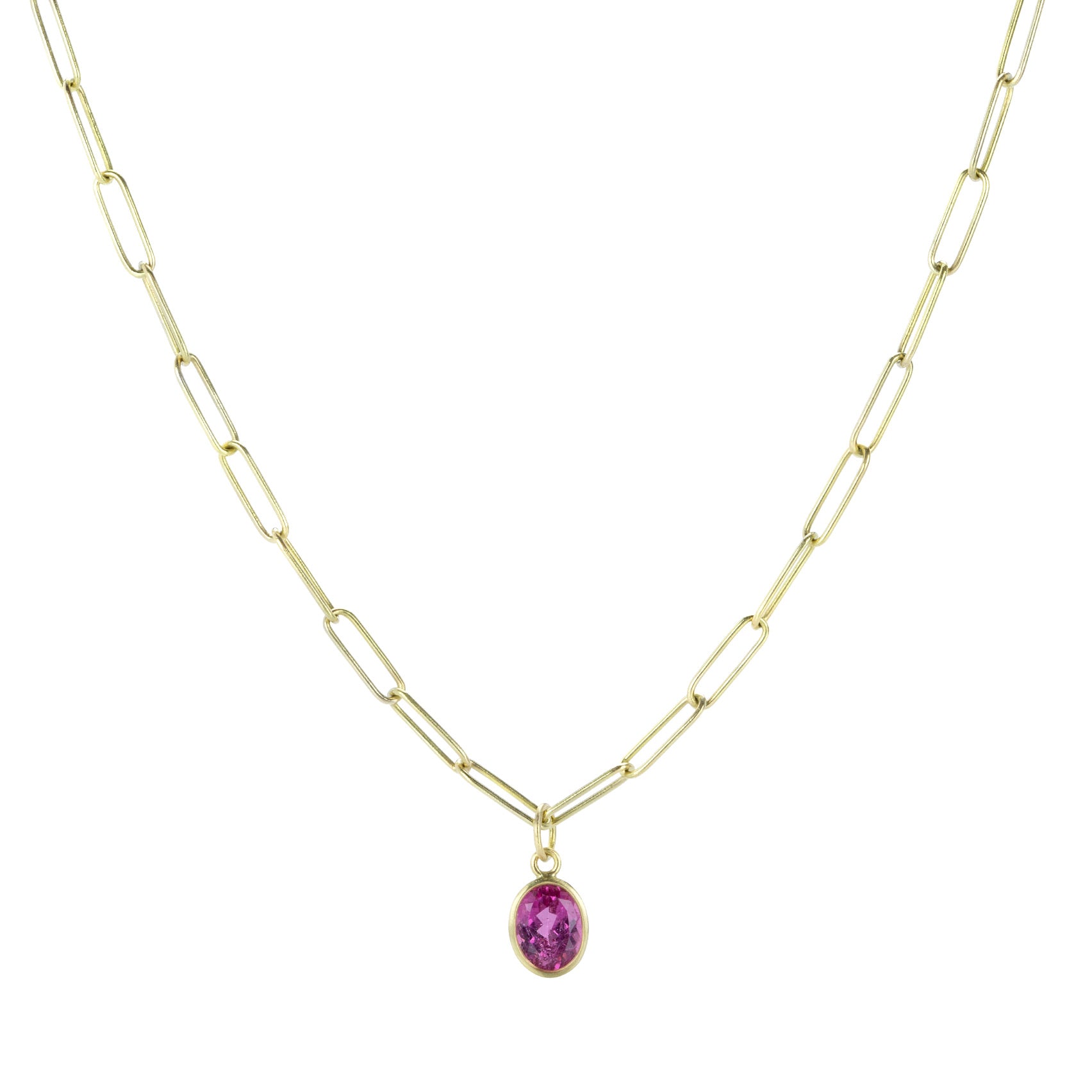The warm, rich tones of 18k yellow gold complement the vibrant pink of tourmaline in this eye-catching pendant from Maria Beaulieu. The playful, elegant piece features an oval, faceted, 8mm x 10mm rubellite tourmaline, perfect for layering with other pendants or standing alone for a pop of color. Pendant measures approximately 3/8" x 1/4” including bail. Chain sold separately. Handcrafted in Brooklyn, NY, U.S.