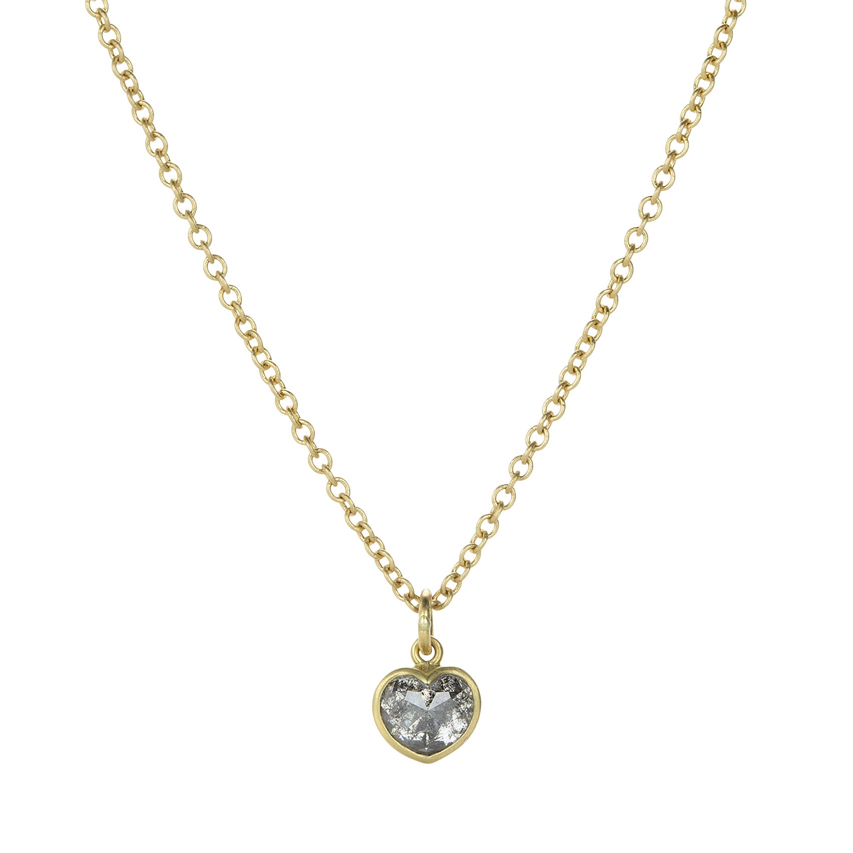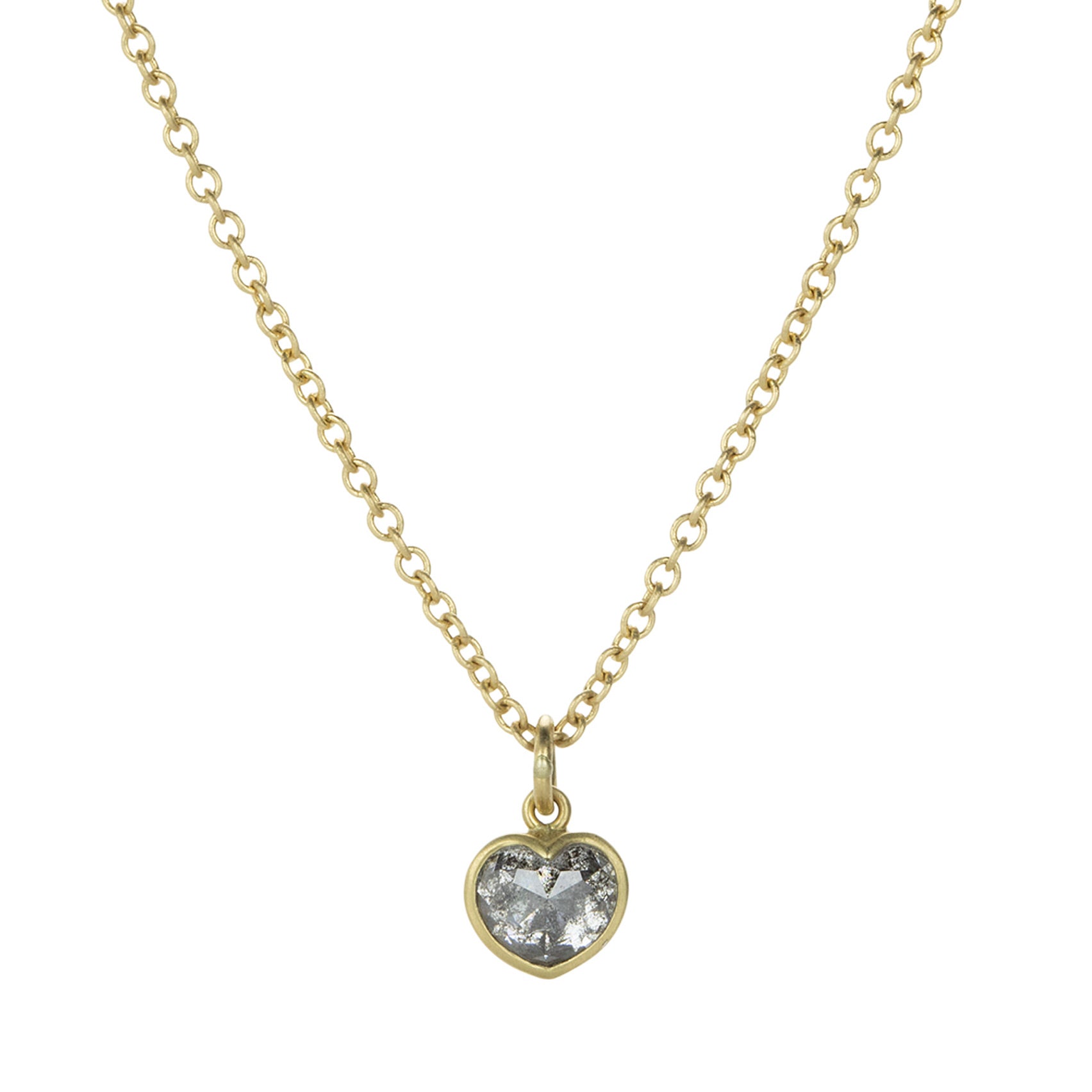 Infuse yourself with the sparkling spice of life in this 18k yellow gold necklace from Lola Brooks. A heart shaped 1.20ct faceted peppery diamond is bezel set simply and hangs from a fine gold chain. Pendant measures just under 1/2” in length, including the bail. Total cable chain length measures 18”. Handcrafted in Lexington, GA, U.S.