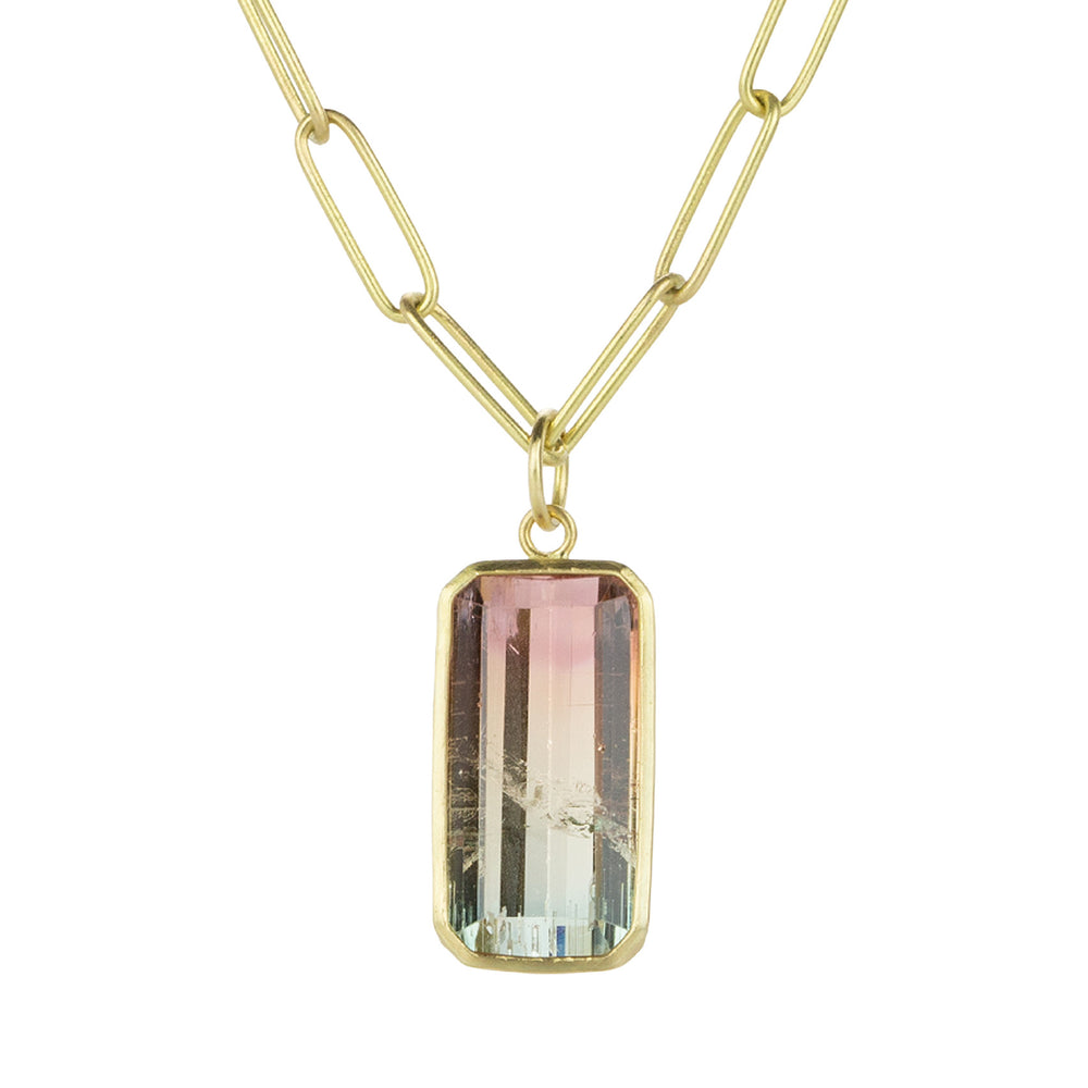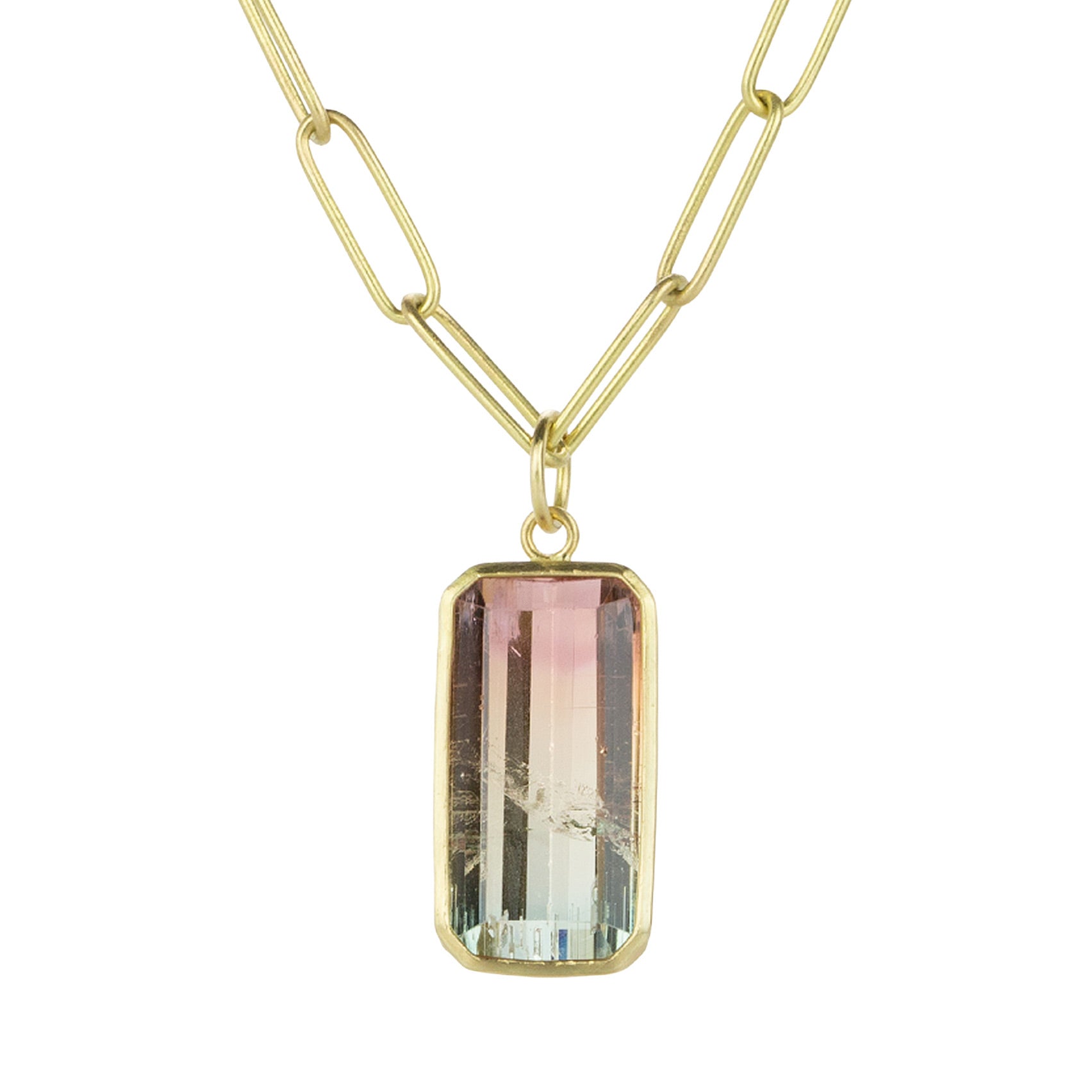Wear a piece of the earth’s magic, presented like only Maria Beaulieu can! This 18k yellow gold pendant features an emerald cut tourmaline that fades from a pale minty green to a blush of pink. Pair it with one of the artist’s coveted handmade chains to complete the designer look. Pendant length measures 3/4” including the bail. Chain is sold separately. Handcrafted in Brooklyn, NY, U.S.