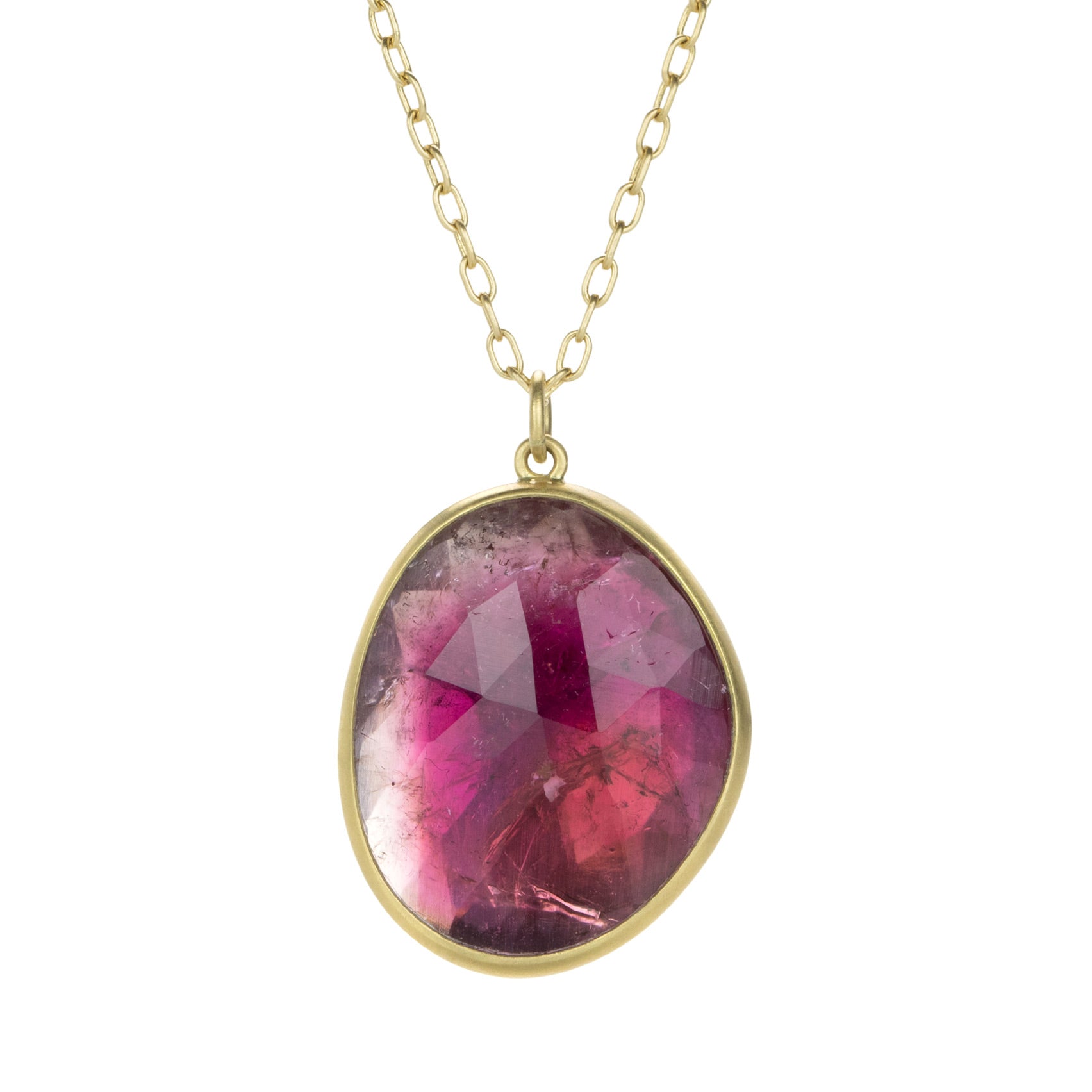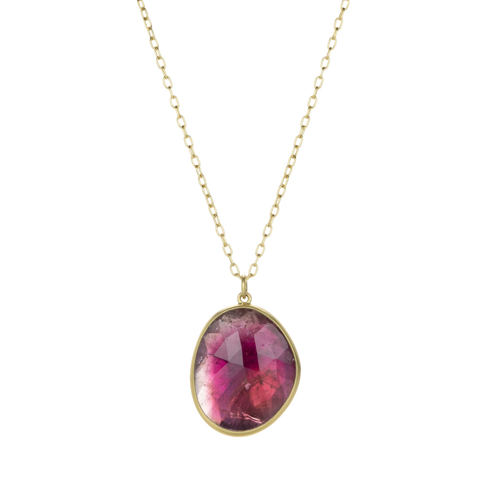 Rich, natural color steals the show in this 18k yellow gold necklace from Lola Brooks, featuring a freeform, faceted 16.77ct pink tourmaline pendant. The simplicity of the brushed gold bezel lets the stone send its energy far and wide. Pendant measures 1” x 3/4” including bail. Total cable chain length with lobster clasp measures 18”. Handcrafted in Lexington, GA, U.S.
