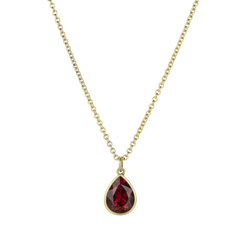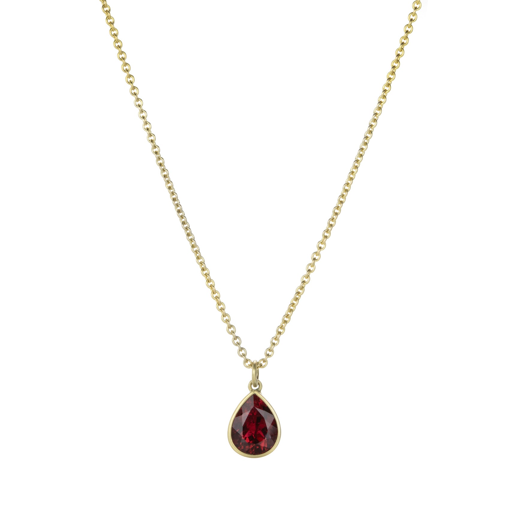 The passion is palpable in this 18k yellow gold necklace from Lola Brooks. A faceted 2.74ct red tourmaline is set simply in a brushed gold bezel that lets the color shine. Mysterious, beautiful and versatile, this is the type of piece that becomes part of the fabric of your being. Pendant length measures just under 1/2”, including the bail. Cable chain length measures 18”. Handcrafted in Lexington, GA, U.S.