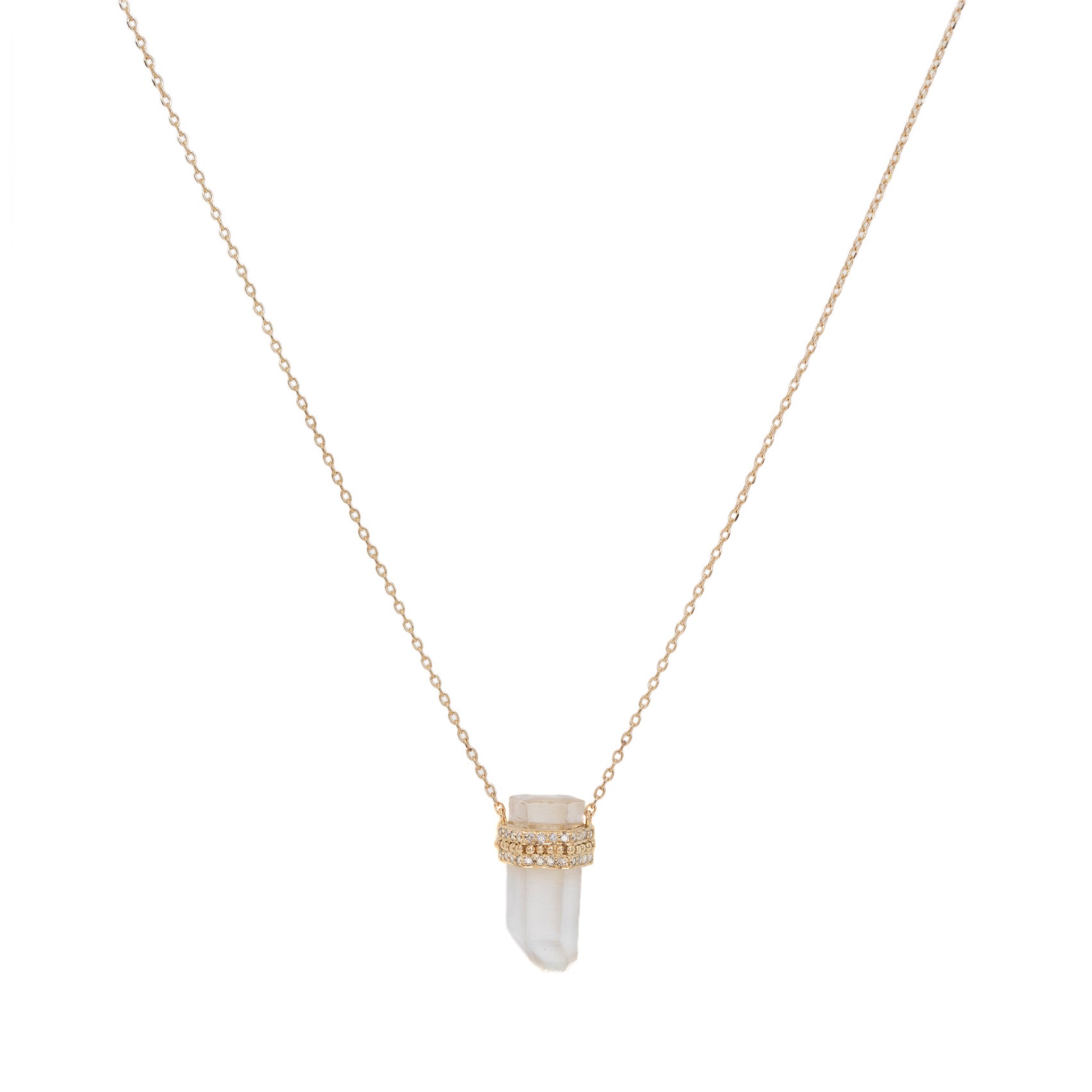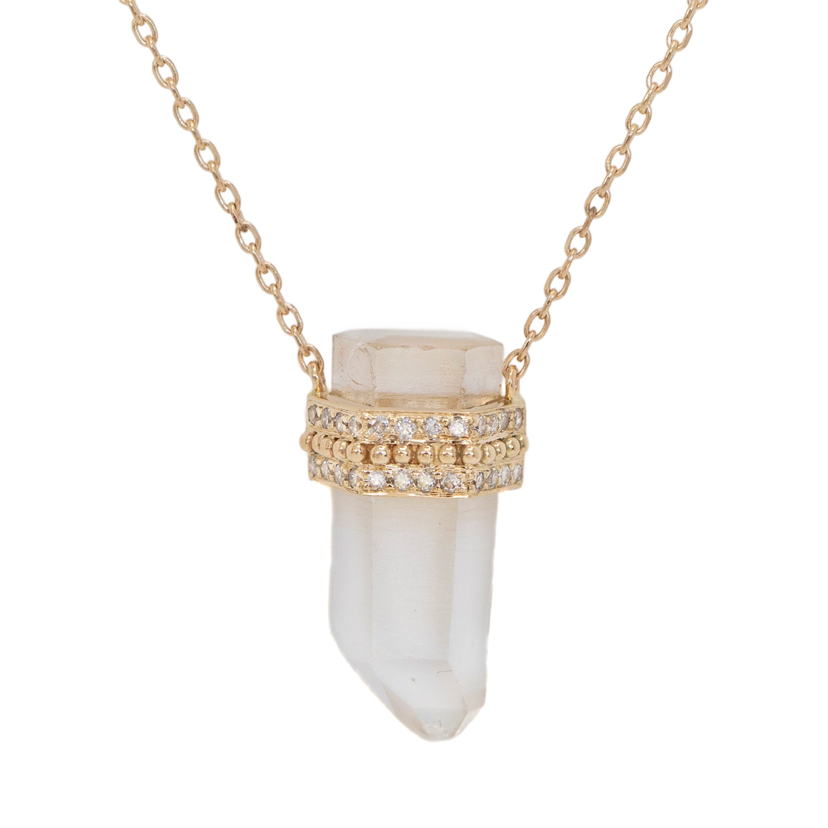 A 14k yellow gold chain with a rough cut, quartz pencil pendant with white diamonds. Pendant measures 3/4" on a chain that can be worn at 16", 17" or 18". Handcrafted in Belgium